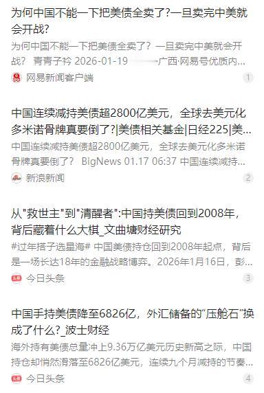 为何中国不能一下把美债全卖了?就这么说吧,中国今天敢全抛售,明天中美就有可能开战,因为中国手里的美债早就不是一张张普通的债券,更像是一根拿在手里的“金融核按钮”。 麻烦看官老爷们右上角点击一下“关注”,既方便您进行讨论和分享,又能给您带来不一样的参与感,感谢您的支持! 就这么说吧,中国手里的美债早就不是一张张普通的债券,更像是一根握在掌心的 “金融核按钮”。但要说今天全抛售明天就开战,其实并不准确 —— 金融博弈有自身的规则和边界,战争的成本远高于美债市场波动的损失,中美双方都清楚这一点,真正需要警惕的是抛售引发的双向经济灾难。 2008 年金融危机爆发后,全球市场一片恐慌,投资者对风险的敏感度大幅提升。当时美国为了救市大规模发债,中国作为外汇储备大国,被动增持美债至 6962 亿美元,首次成为全球最大美债持有国,这既是当时外汇储备保值的选择,也是稳定全球金融市场的无奈之举。 此后几年,中国的美债持仓持续增长,2013 年达到 1.32 万亿美元的历史峰值,占当时美国国债总额的 12%。那时候,美债凭借其规模和流动性,是全球外汇储备配置的主要选择,中国的大量持有,在一定程度上支撑了美元资产的稳定性。 但随着时间推移,情况逐渐发生变化。美国债务规模一路飙升,从 2008 年的 10 万亿美元涨到 2025 年的 38.4 万亿美元,相当于其 GDP 的 130% 以上,2025 年联邦政府利息支出更是高达 1.2 万亿美元,首次超过国防预算。穆迪等评级机构也下调了美债信用评级,让美债的 “无风险资产” 标签打了折扣。 更让人警惕的是,美国频繁将美元霸权工具化,冻结他国外汇储备的案例时有发生,这让中国不得不重新评估美元资产的安全性。于是从 2017 年开始,中国逐步开启减持之路,日本重新夺回美债最大持有国的位置,中国退居第二。 到 2022 年 4 月,中国持有的美债规模首次跌破 1 万亿美元大关,之后减持节奏并未放缓。2025 年 3 月,中国单月减持 189 亿美元,持仓被英国超越,首次退居全球第三大美债持有国,这一排名一直保持至今。 截至 2025 年 11 月,中国持有的美债规模降至 6826 亿美元,创下 2008 年以来的最低水平。从 2022 年到 2025 年 11 月,累计减持规模已近半数,这一趋势清晰地展现了中国外汇储备配置的战略调整。 可能有人会问,既然一直在减持,为什么不干脆一次性全抛了,一了百了?其实这背后全是实打实的经济考量,一次性抛售就是 “伤敌一千自损八百” 的赔本买卖。 中国手里近 7000 亿美元的美债体量太大,当前美债市场流动性大不如前,换手率从 2007 年的 12.6% 跌到 2024 年的 3.2%,这么大规模的债券突然涌入市场,根本找不到足够的接盘侠。 没有接盘侠就会导致美债价格断崖式下跌,我们只能折价甩卖,多年积累的外汇储备会凭空蒸发数千亿美元,相当于自己的财富直接缩水。而且美元贬值会让人民币相对升值,严重打击中国的出口竞争力,影响无数外贸企业和就业岗位。 美国绝不会坐视不管。如果中国一次性清仓,大概率会被美方定义为 “定向金融打击”,进而引发强烈反制。参考西方对俄罗斯的制裁,被逐出 SWIFT 系统、冻结海外金融账户、加征天价关税、封锁供应链等手段都可能用上,这对中国经济的冲击难以估量。 再者,全球目前还没有任何一种资产能替代美债的市场规模和流动性,一次性抛售后获得的巨额美元会面临 “无处可去” 的困境,反而会造成外汇储备的闲置和浪费。 所以说,一次性抛售美债看似是强硬的反制,实则是非理性的选择,既不符合中国的核心利益,也违背了大国金融博弈的基本逻辑。 中国选择的是 “温水煮青蛙” 式的渐进式减持策略,72% 的持仓都是 1-5 年期中短期债券,主要通过 “到期不续” 的方式调整,避免集中抛售冲击市场,最大限度降低资产缩水风险。 在减持美债的同时,中国正在加速推进外汇储备多元化。从 2025 年 3 月开始,中国央行连续 14 个月增持黄金,截至 2025 年 12 月末,黄金储备达到 7415 万盎司,占外汇储备的比例从 2023 年的 3.9% 升至 6.4%-7.3%,黄金的避险属性为外汇储备筑牢了安全屏障。 除了增持黄金,中国还在大力推动人民币国际化。人民币跨境支付系统(CIPS)已覆盖 189 个国家和地区,2025 年经常项下跨境人民币结算金额达 17.86 万亿元,占同期本外币跨境收付的比重达到 28%。中国还与 32 个国家和地区签署了本币互换协议,总额超 4.5 万亿元人民币。