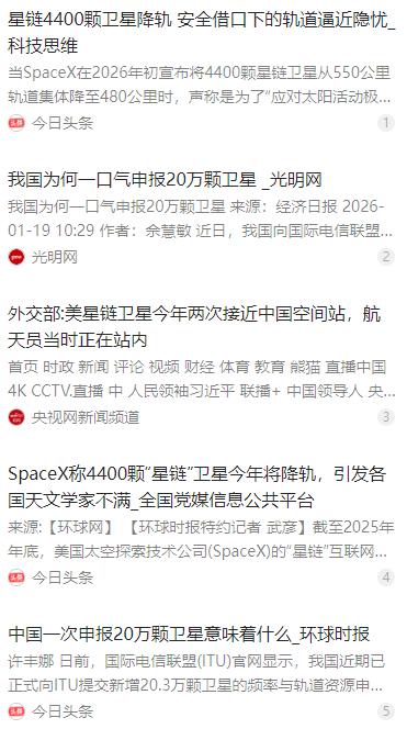 反制,开始了!马斯克的星链卫星之前两次逼近中国空间站,本以为没掀起太大风浪就没事,没想到这事儿的后续来得这么实在。 麻烦看官老爷们右上角点击一下“关注”,既方便您进行讨论和分享,又能给您带来不一样的参与感,感谢您的支持! 2021 年,马斯克旗下 SpaceX 的星链卫星两次逼近中国空间站,当时没引发太大波澜,很多人以为这事就这么过去了。谁也没想到,看似平静的背后,中国早已悄悄布局,一场针对太空安全与资源争夺的反制行动,正在稳步推进。 这两次危险接触并非意外。2021 年 7 月,星链 - 1095 卫星从 555 公里轨道降至 382 公里,直接逼近中国空间站运行的 390-400 公里轨道区间。同年 10 月,星链 - 2305 卫星再次近距离靠近,当时神舟十三号航天员正在舱外执行任务。 为保障航天员生命安全,中国空间站不得不两次中断正常科研活动,紧急调整轨道避险。事后中国外交部证实了这两起事件,并通过常驻维也纳联合国代表团向联合国秘书长通报情况,指出美方应承担相应国际责任。 这两起事件虽未造成实质性碰撞,却像一记警钟,让太空安全问题浮出水面。更值得警惕的是,星链的扩张从未停止。截至 2025 年底,其在轨卫星已近 1 万颗,占全球活跃航天器的 60%,密集分布在 320-550 公里的低轨 “黄金地带”。 2026 年初,SpaceX 宣布将 4400 颗星链卫星从 550 公里轨道降至 480 公里,声称是为了缩短失效卫星脱轨时间。但这一调整让星链与中国空间站的轨道垂直距离从 160 公里缩小到 80 公里,对具备频繁变轨能力的星链卫星来说,这个距离仅需几次机动就能跨越。 低轨轨道与频谱资源是不可再生的稀缺资源,按当前技术估算,近地轨道最多只能容纳约 17.5 万颗卫星。而全球各国的申报总量早已突破这一阈值,星链凭借先发优势 “圈地”,让其他国家的航天发展空间不断被压缩。 面对这种被动局面,中国的反制措施来得扎实又有力。2025 年底,中国向国际电信联盟(ITU)正式申报了 20.3 万颗卫星的频轨资源,覆盖 14 个卫星星座,这是我国迄今规模最大的一次集中申报行动。 很多人疑惑,为何要申报这么多卫星?其实这是遵循 ITU “先占先得” 规则的必要举措。在太空资源争夺白热化的当下,早申报才能锁定未来发展空间,避免优质轨道被瓜分殆尽,这是典型的战略预留布局,完全符合国际规则。 更关键的是,中国有足够的技术实力支撑这一宏伟计划。经过多年自主研发,我国在低轨卫星组网、可重复使用火箭等核心领域已实现突破,航天科技集团五院更是将单颗卫星生产周期压缩至 20 天左右,具备了批量制造能力。 发射端同样底气十足,我国航天发射场已进入常态化运行阶段,通过扩容发射工位、优化测控网络,为大规模卫星部署提供运力保障。芯片、高端碳纤维等关键材料的自主可控,也让供应链不再受制于人。 中国申报 20 万颗卫星,绝非单纯追求数量比拼。这些卫星星座主要聚焦通信、遥感、导航等民用领域,既要实现全球覆盖,更要通过科学规划,参与轨道资源的合理分配与管理,从根本上降低碰撞风险。 在保障航天安全方面,我国已部署 “巡天” 空间望远镜网络,能实时追踪厘米级太空碎片,为空间站装上 “千里眼”。天宫空间站还加装了激光离轨装置,可在 10 秒内汽化威胁目标,构建起主动防御屏障。 服务民生是另一重要目标。低轨卫星网络能让偏远地区实现高速上网,为灾害救援提供稳定通信,在农业遥感、环境监测等领域发挥重要作用,真正让航天技术惠及普通民众。 这一计划更蕴含着对全球太空秩序的主动担当。中国正携手俄罗斯、巴西等国,提出 “平等使用、共同治理” 的低轨资源分配新方案,推动构建 “先评估、后部署” 的国际监管机制,破解当前 “重申报、轻监管” 的乱象。 我国还在卫星设计中搭载离轨帆装置,确保卫星退役后能主动脱离轨道,减少太空碎片。此前首次主动向 NASA 通报卫星碰撞风险并提议主动变轨,被赞为全球太空交通管理的关键突破。 需要明确的是,20.3 万颗的申报数量不等于最终实际部署量。根据 ITU 规则,申报者需在 7 年内发射首星,14 年内完成全部部署,否则频轨资源将被收回。我国会根据技术成熟度、市场需求动态调整,体现了务实审慎的态度。 相比星链在俄乌冲突中承担军事通信功能的做法,中国的卫星计划始终坚守民用属性,践行《外层空间条约》精神,反对太空军事化,为太空的和平利用树立了典范。 从两次紧急避撞到主动布局 20 万颗卫星,中国的行动既是对星链逼近事件的合理反制,更是对太空可持续发展的责任担当。这不是要搞 “太空圈地”,而是要在国际规则框架内,为自己争取合理发展空间。