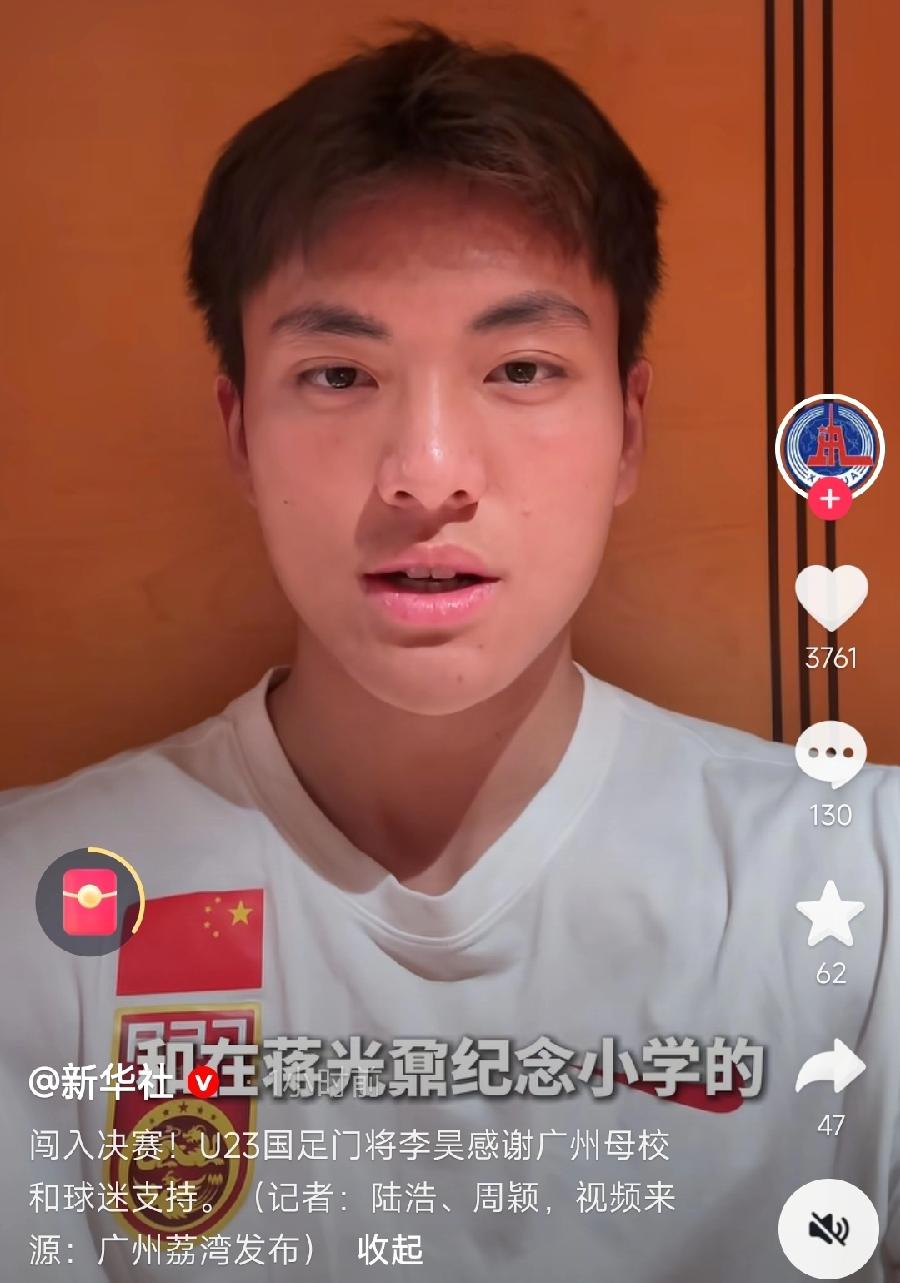 李昊,上新华社了!国媒加持,前途无量!李昊感谢了母校蒋光鼐纪念小学、荔湾区体校训练学校,知道来时路、懂感恩!我会继续为国争光,希望母校小朋友们为了梦想努力,觉悟很高、回答很正确!最特别是,最后用粤语,多谢广州街坊支持!李昊虽然祖籍河南南阳人,但是出生、成长在广州,宗祠、社区文化发达,这一句很广东!李昊身价暴涨、未来可期,国足新一代门神诞生!