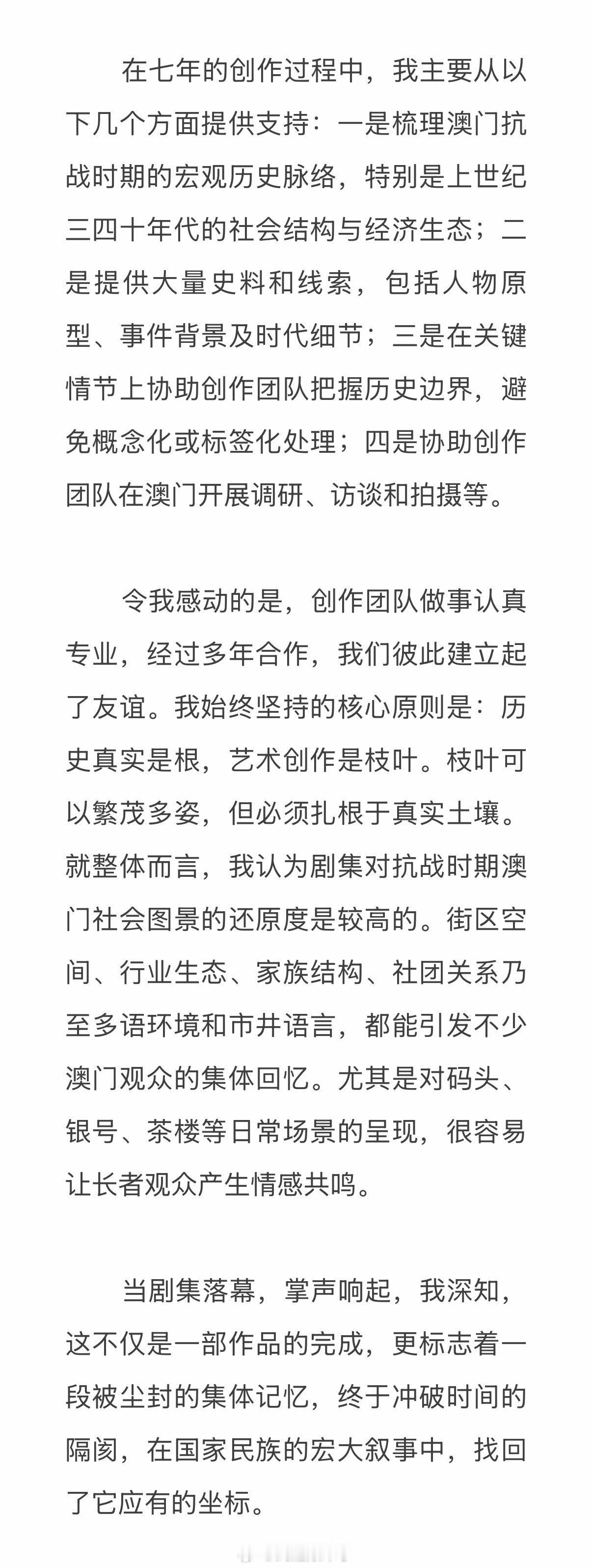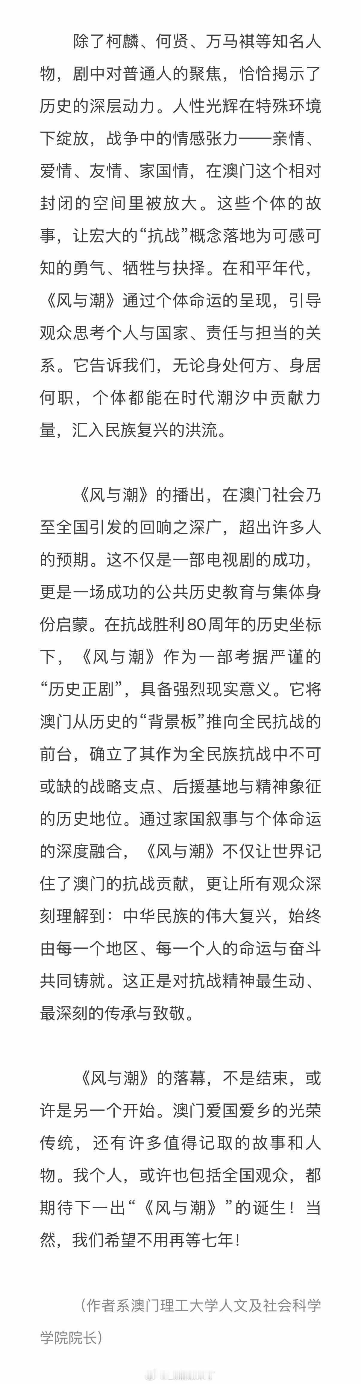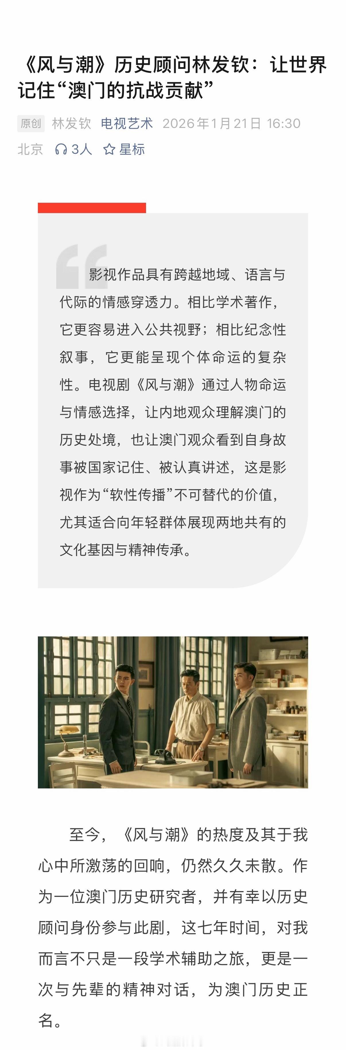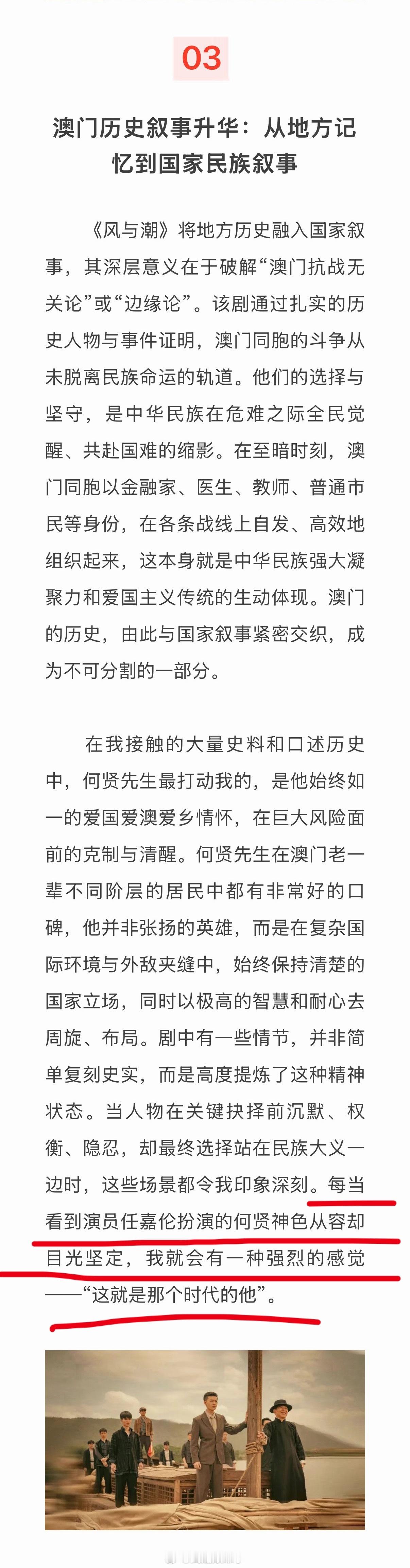 《风与潮》历史顾问,澳门理工大学人文及社会科学学院院长林发钦在电视艺术公众号发长文:《让世界记住“澳门的抗战贡献”》他说:每当看到演员任嘉伦扮演的何贤神色从容却目光坚定,我就会有一种强烈的感觉——“这就是那个时代的他”。