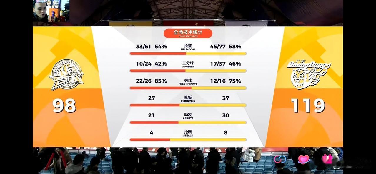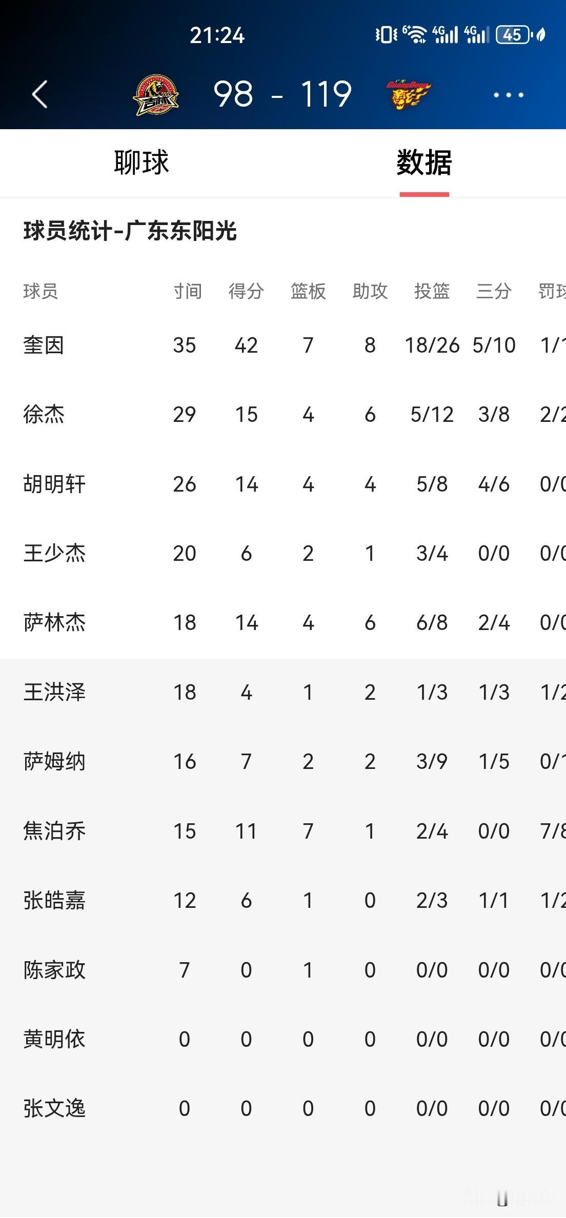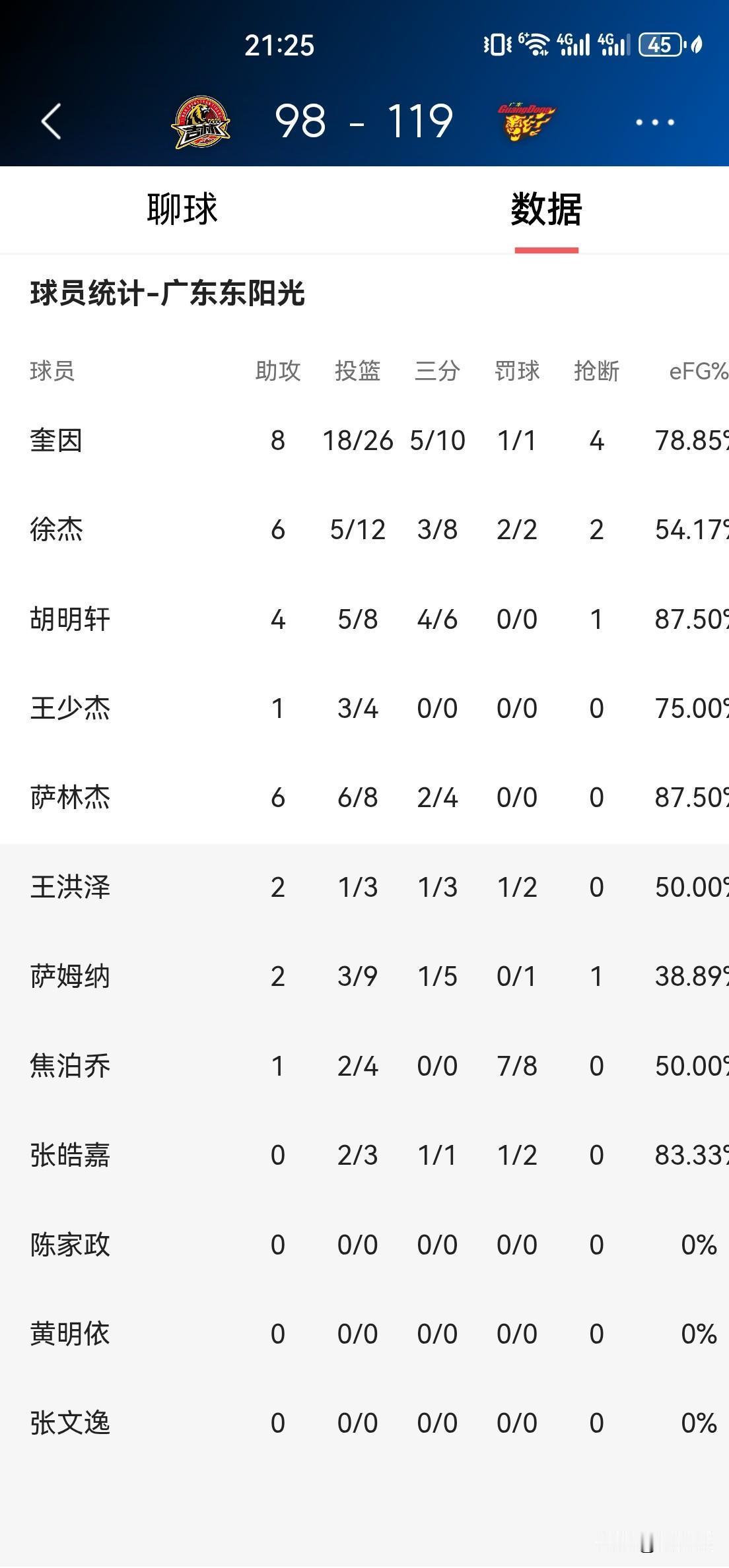 奎因无所不能,胡明轩、徐杰状态回勇,华南虎客场轻松擒拿东北虎。 本场比赛两队在进攻端都打出极高水平,这从98:119的超高比分可以看得出来。 数据对比方面: 整体投篮命中率54%:58%、三分球命中率42%:46%,两项数据广东均高出4个百分点,篮板球27:37,广东多出10个,投篮次数61:77,广东多出16次之多,一场大胜在所难免。 广东队奎因26投18中,其中三分球10投5中,砍下42分7篮板8助攻4次抢断;徐杰12投5中,拿到15分4篮板6助攻2抢断;胡明轩8投5中,其中三分球6投4中,拿到14分4篮板4助攻。广东后场双子星状态双双勇归,为三天后主场迎战强敌山西队增添筹码。 客场连续大胜,杜锋心情舒畅,盛赞钟诚带队水平高、东北虎主场很难打,广东胜在兵多将广。