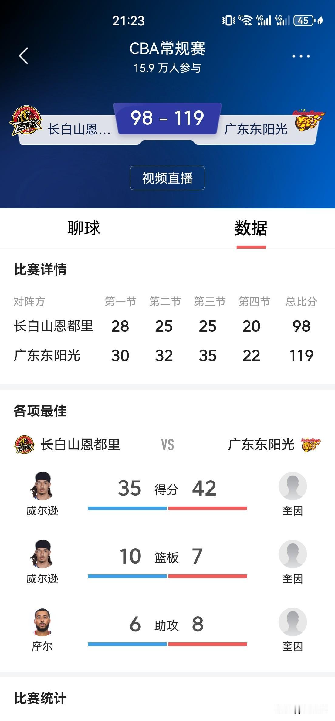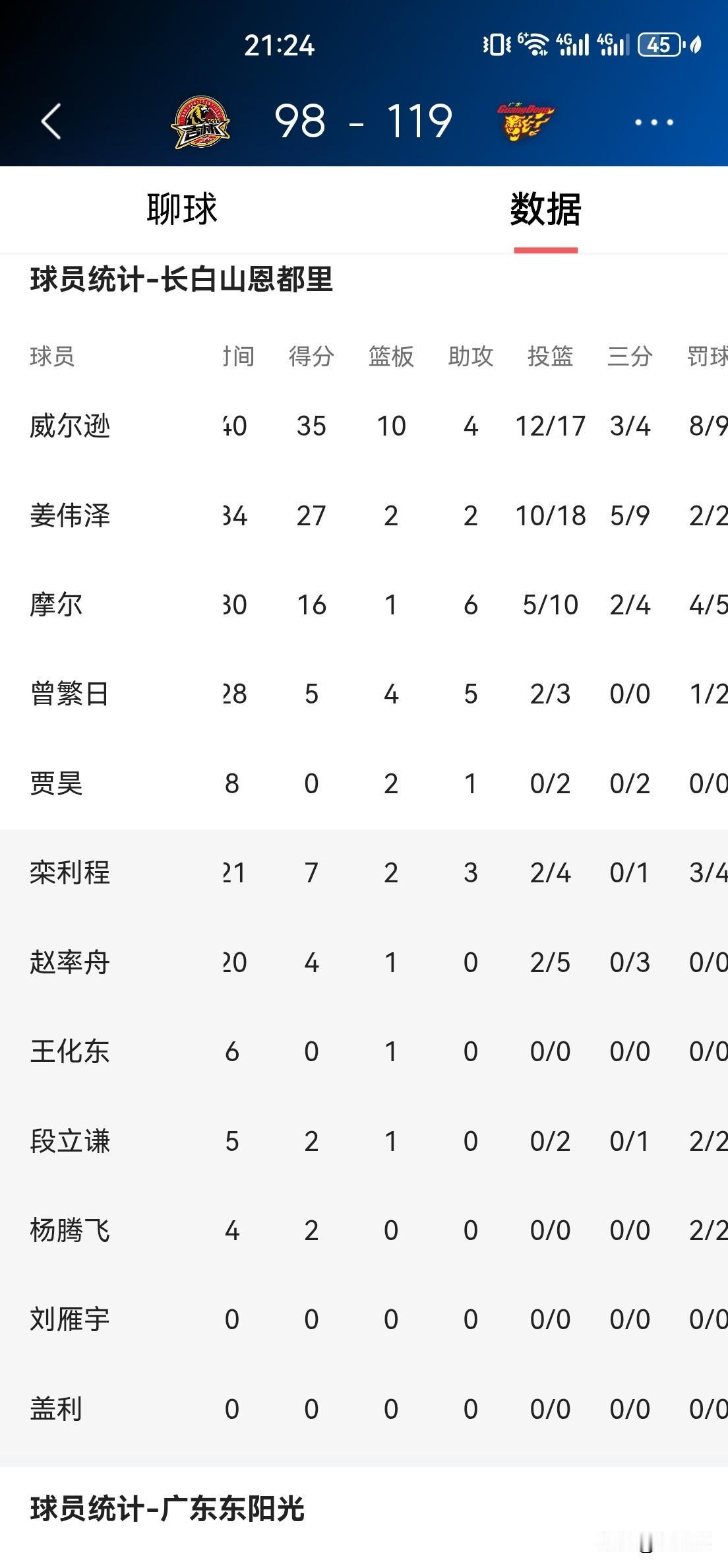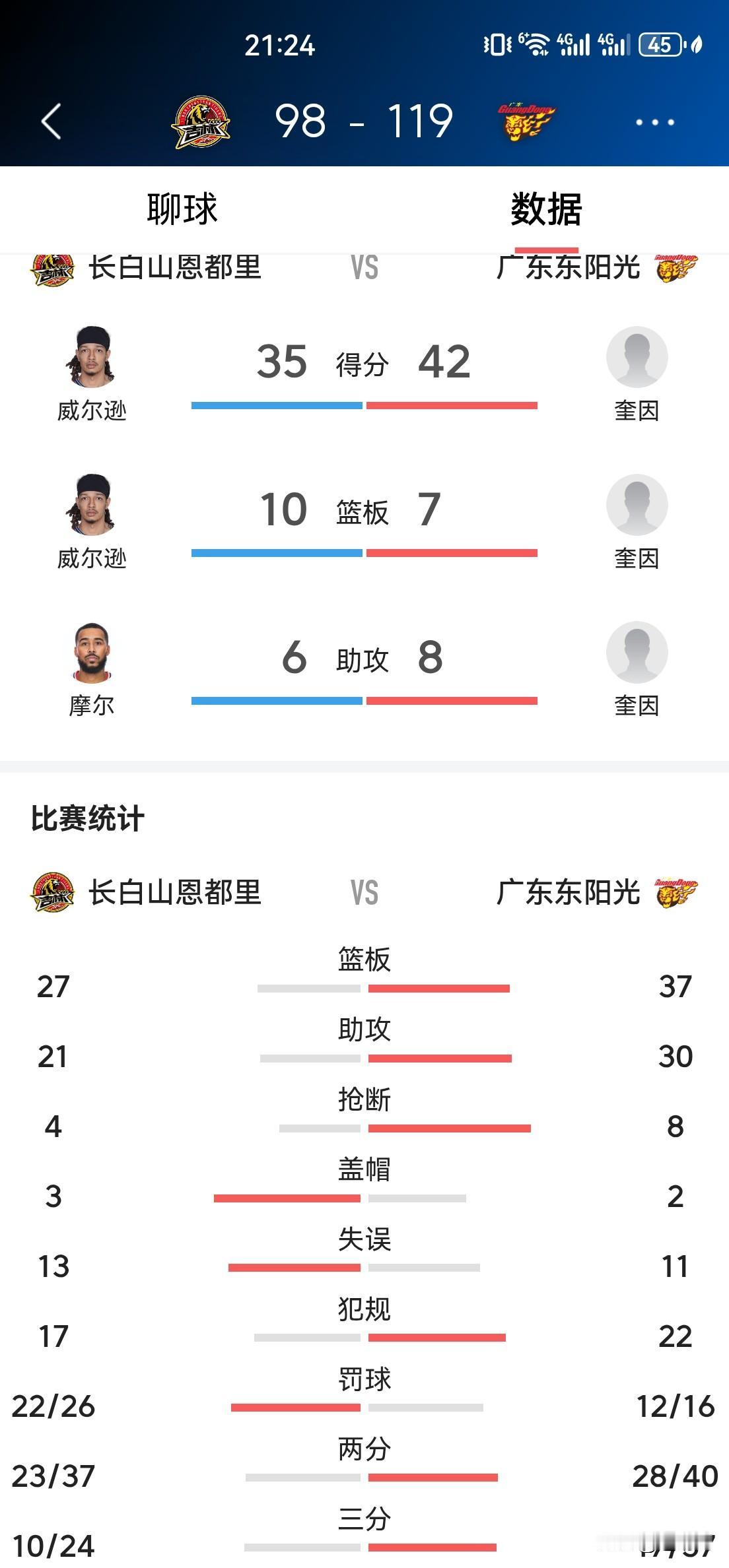 奎因无所不能,胡明轩、徐杰状态回勇,华南虎客场轻松擒拿东北虎。 本场比赛两队在进攻端都打出极高水平,这从98:119的超高比分可以看得出来。 数据对比方面: 整体投篮命中率54%:58%、三分球命中率42%:46%,两项数据广东均高出4个百分点,篮板球27:37,广东多出10个,投篮次数61:77,广东多出16次之多,一场大胜在所难免。 广东队奎因26投18中,其中三分球10投5中,砍下42分7篮板8助攻4次抢断;徐杰12投5中,拿到15分4篮板6助攻2抢断;胡明轩8投5中,其中三分球6投4中,拿到14分4篮板4助攻。广东后场双子星状态双双勇归,为三天后主场迎战强敌山西队增添筹码。 客场连续大胜,杜锋心情舒畅,盛赞钟诚带队水平高、东北虎主场很难打,广东胜在兵多将广。