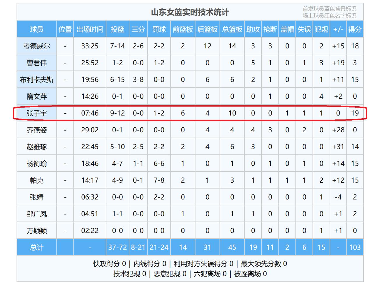 7分46秒!12投9中,轰19分10板 18岁2米26中锋打出巨星水平 WCBA常规赛,山东队做客对阵陕西队,双方经过四节Pk,最终,山东队以103-77赢了陕西队足足26分,收获了一场酣畅淋漓的大胜。本场比赛,山东队2米26的小将张子宁,创造了个人WCBA的两项新高,得分和篮板球,都是创造了一个新纪录。 从本场比赛来看,张子宇首发出场,帮助山东队建立了优势,但是,随着张子宇下场休息之后,陕西队就逐步反超了比分,到首节比赛结束,陕西队以38-27领先山东队11分。然而,进入第二节比赛之后,陕西队的表现如同梦游,在进攻端频频打铁,反观,山东队内外结合,多点开花,轰出了28-7的进攻浪潮,到半场结束,山东队反超了陕西队10分。 下半场比赛,山东队继续发力,不断扩大领先优势,到了末节比赛,山东队将领先的优势扩大到了20分以上,让比赛完全失去胜负悬念,最终,山东队以26分的巨大优势击败了陕西队,笑到了最后。 全场比赛,2米26的张子宇,一共打了7分46秒,第一节比赛,打了4分06秒,投篮5中5,砍下了10分4篮板。第二节比赛、第三节比赛,张子宇都是没有打。到了末节比赛,张子宇再一次登场,打了3分钟40秒,投篮7中4,交出了9分6篮板,就这样,张子宇轻松交出了19分10篮板1盖帽的两双数据。(10个篮板球当中,其中,有6个是进攻篮板球。) 本场比赛,张子宇创造了3个WCBA个人职业生涯新高: 1、19分,个人WCBA得分新高。 2、10篮板,个人WCBA篮板球新高。 3、19分10篮板,个人首个WCBA联赛的两双。 实话实说:从目前,山东队对张子宇的使用来看,可以说,还存在着比较大的问题,比如,队友之间默契不够。比如,对张子宇制定的战术打法,还存在比较多的问题,还不能够完全发挥张子宇的优势。甚至可以说,张子宇的作用,山东队还没有开发到10%。 当然了,在此,也是相信山东队教练组,会有办法开发张子宇的价值,同时,也是希望张子宇再接再厉,打出更多精彩的比赛。加油!