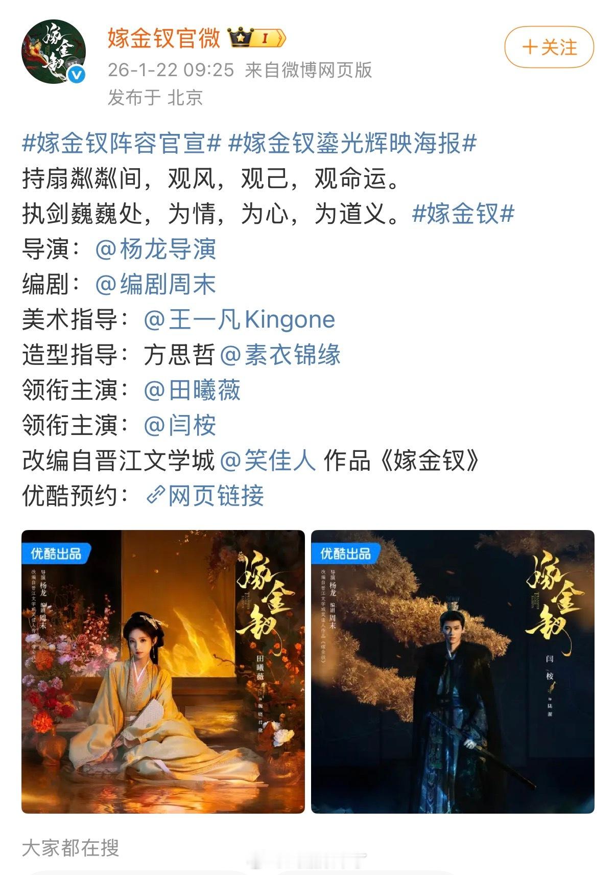 嫁金钗阵容官宣田曦薇、闫桉《嫁金钗》全阵容官宣连美术指导、造型指导都在男女主前面