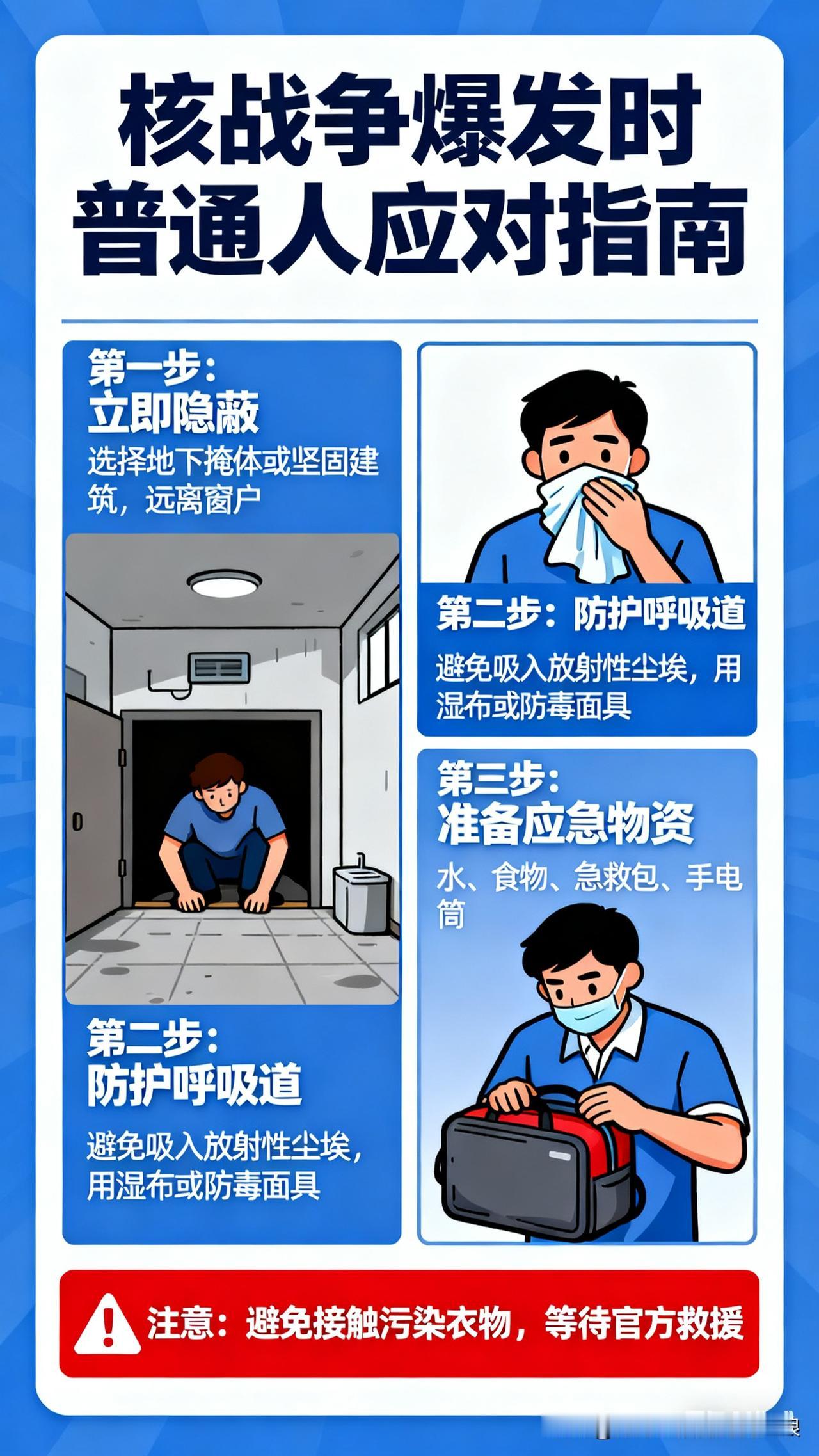 一旦爆发核战争,普通人该怎么做?真要是核战来了,别慌也别傻站着,每一秒都能救命!看到强光瞬间立马卧倒,护好头别睁眼,憋气几秒别吸热风,远离电线杆和窗户,玻璃碎片能划死人。接着赶紧往地下钻,地铁站、地下车库都是首选,没地下的就躲一楼承重墙根,封死门窗缝。进屋先脱外衣密封,用清水擦脸和手,别抖衣服沾辐射。至少躲48小时,别出门别喝生水,不吃露天的东西。囤好瓶装水和密封吃的,听官方消息别信谣言。核战概率低,但这些招必须记牢,真用到的时候,能活下来才是硬道理!核战解读 核战毁灭 假如核战来临 超级核战 核战推演 核战避难 核战争防护指南 核灾难避险 一旦爆发核战争,普通人该怎么做?