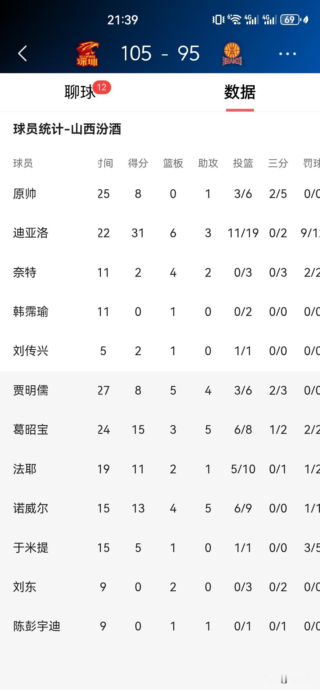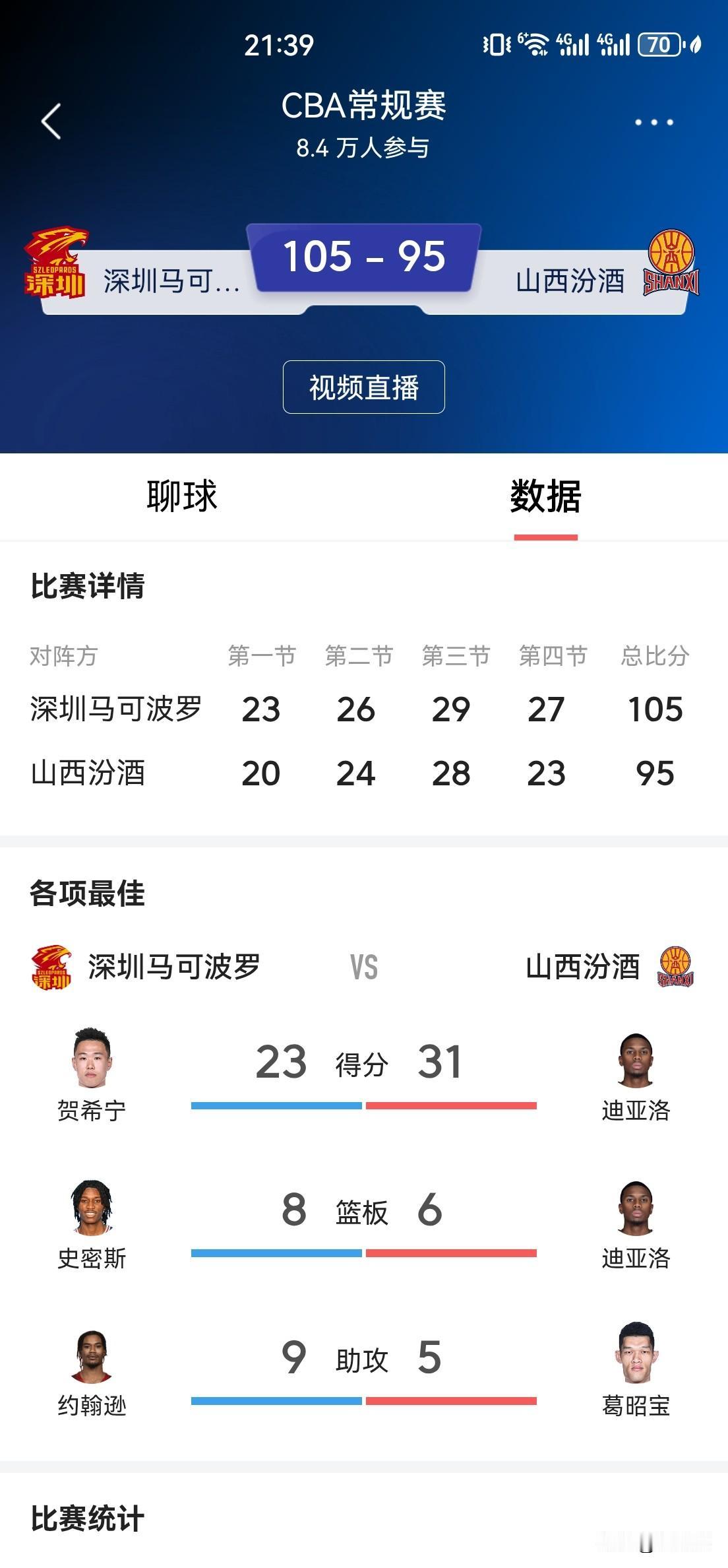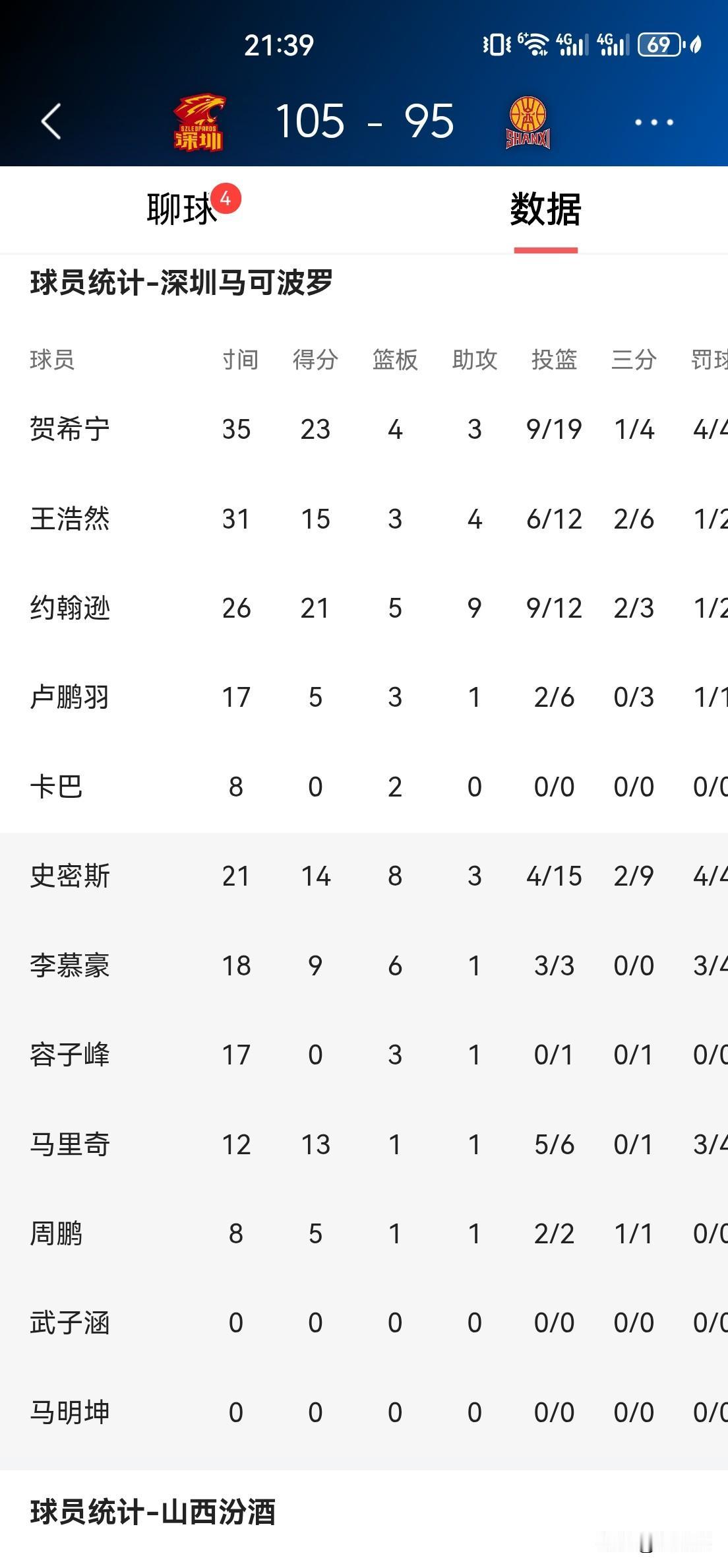 迪亚洛空砍31分山西憾败, 贺希宁力拿23分深圳连胜。 深圳队主场迎战同为9胜7负的对手山西队,寿星公贺希宁19投9中,得到本队最高的23分4篮板3助攻,;约翰逊手感火热,12投9中,三分球三国3中2,拿到21分5篮板9助攻;紧密斯状态回落,15投4中三分球9投2中,得到14分8篮板3助攻;中锋李慕豪状态神勇,3投3中拿下9分6篮板1助攻。 山西队迪亚洛拼劲十足,19投11中砍下31分6篮板3助攻;替补中锋葛昭宝发挥全面,8投6中拿到15分3篮板5助攻;正印中锋刘传兴迷失,仅得到2分1篮板。 深圳队105:95赢下卡位战,三连胜后联赛排名稳居第6位。