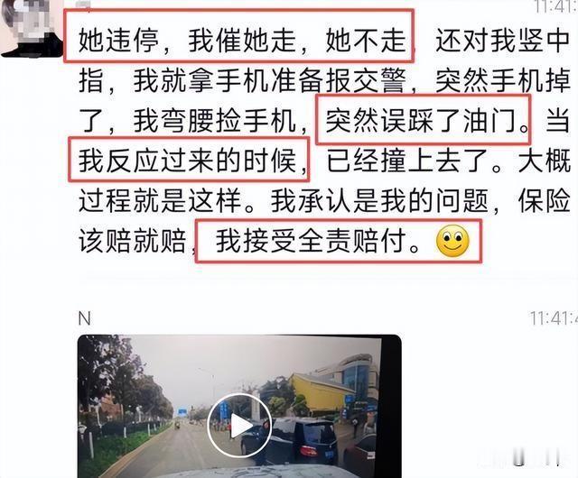 违停不说还慢悠悠的收拾东西 还竖中指,最近昆明的这个大妈 确实有点过了 不过视频车司机把情况也说明了 看她违停竖中指想拿手机报警,结果手机掉了,弯腰捡手机,突然误踩了油门 等他反应过来的时候已经撞了 大概过程就是这样,他还说该怎么样就怎么样,他接受全责赔付 生活中这样的人还真不少,他们完全不会考虑别人,也不会意识到自己有什么问题,这就跟遇到救护车一样的,别人都非常积极的配合让路,偏偏就会有人慢悠悠的或者直接选择无视 等交警找到他的时候,他就会说:“当时我没听到,没看见,真不好意思”