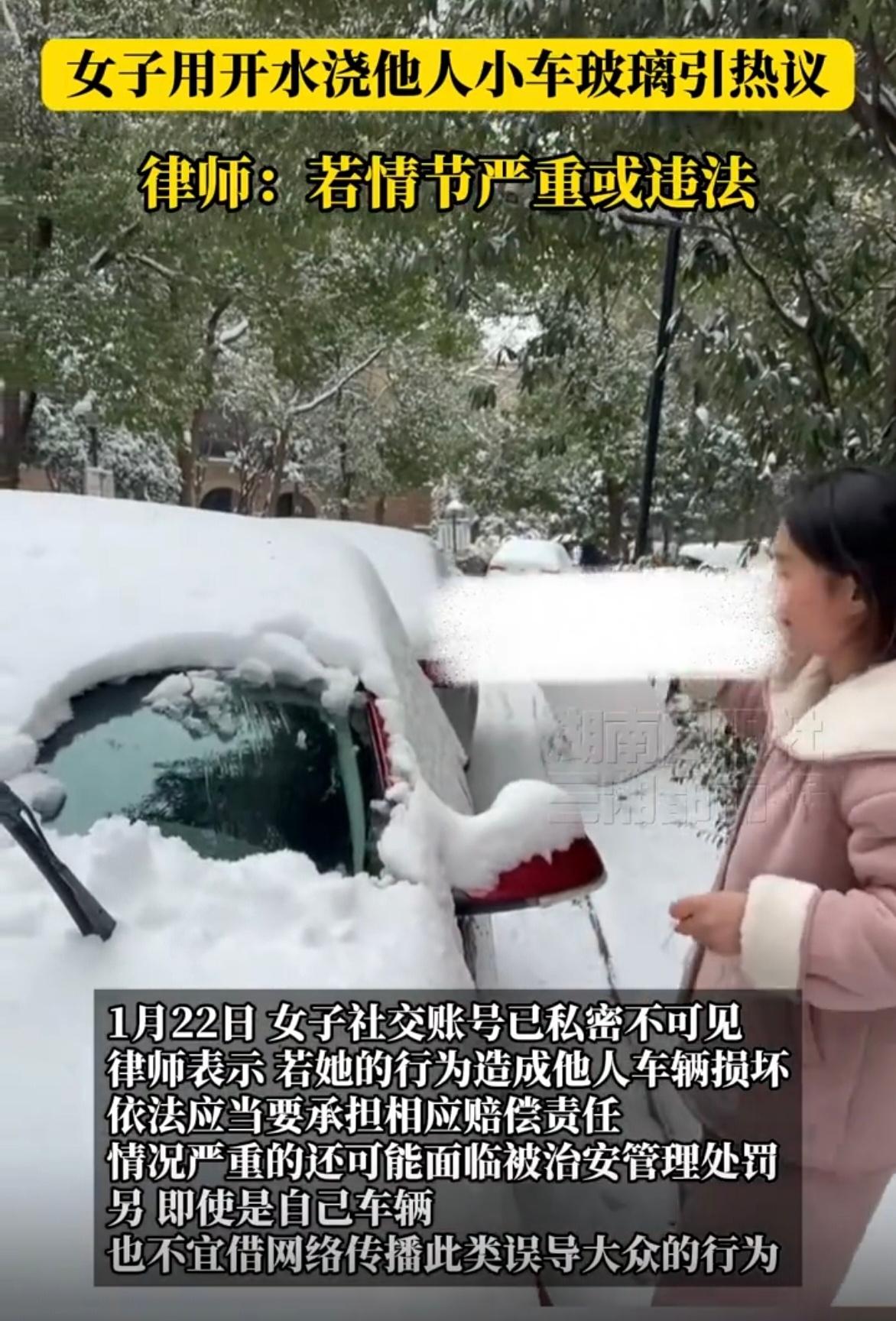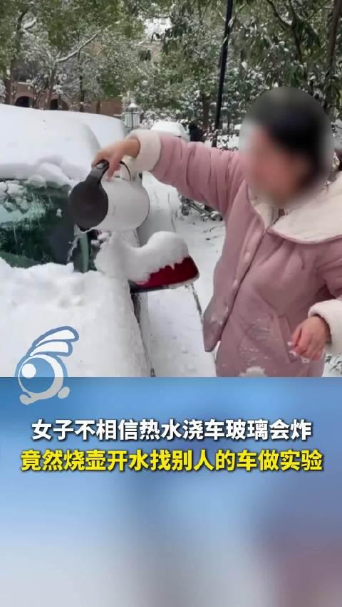 女子用开水浇他人车玻璃测试会否炸裂,这年头,总有人把无知当勇气,把鲁莽当猎奇。 1月21日这位大姐,为了验证“开水浇冻玻璃炸不炸”,直接上演了一出真人迷惑大戏,堪称寒冬限定版“不作不死”。 操作有多离谱?寒冬腊月,对着覆满冰雪的车窗浇刚烧开的沸水,主打一个冷热对冲的极限作死。物理老师听了都要拍桌:热胀冷缩这茬,是被你彻底拉黑了? 更绝的是话术反转。一开始说“随机选车”,妥妥的蓄意霍霍别人财产,争议爆了就改口“测自家车”,变脸速度比玻璃开裂还快,主打一个心虚式圆谎。 网友怒批不是没道理,就算是自家车,这操作也是纯纯的智商税。放着除冰剂、温水不用,偏选最危险的招,怕不是想给汽修店冲业绩? 律师都出来敲黑板了:敢动别人车,赔到你肉疼。还好没真霍霍到旁人,不然既丢面子又掏银子,纯属搬起石头砸自己的车窗。 建议这类“民间科学家”收收味,猎奇有边界,无知没底线。别拿公共利益当实验场,不然下一次,裂开的可能不只是玻璃,还有自己的口碑和钱包。 女子用开水浇他人车玻璃测试会否炸裂