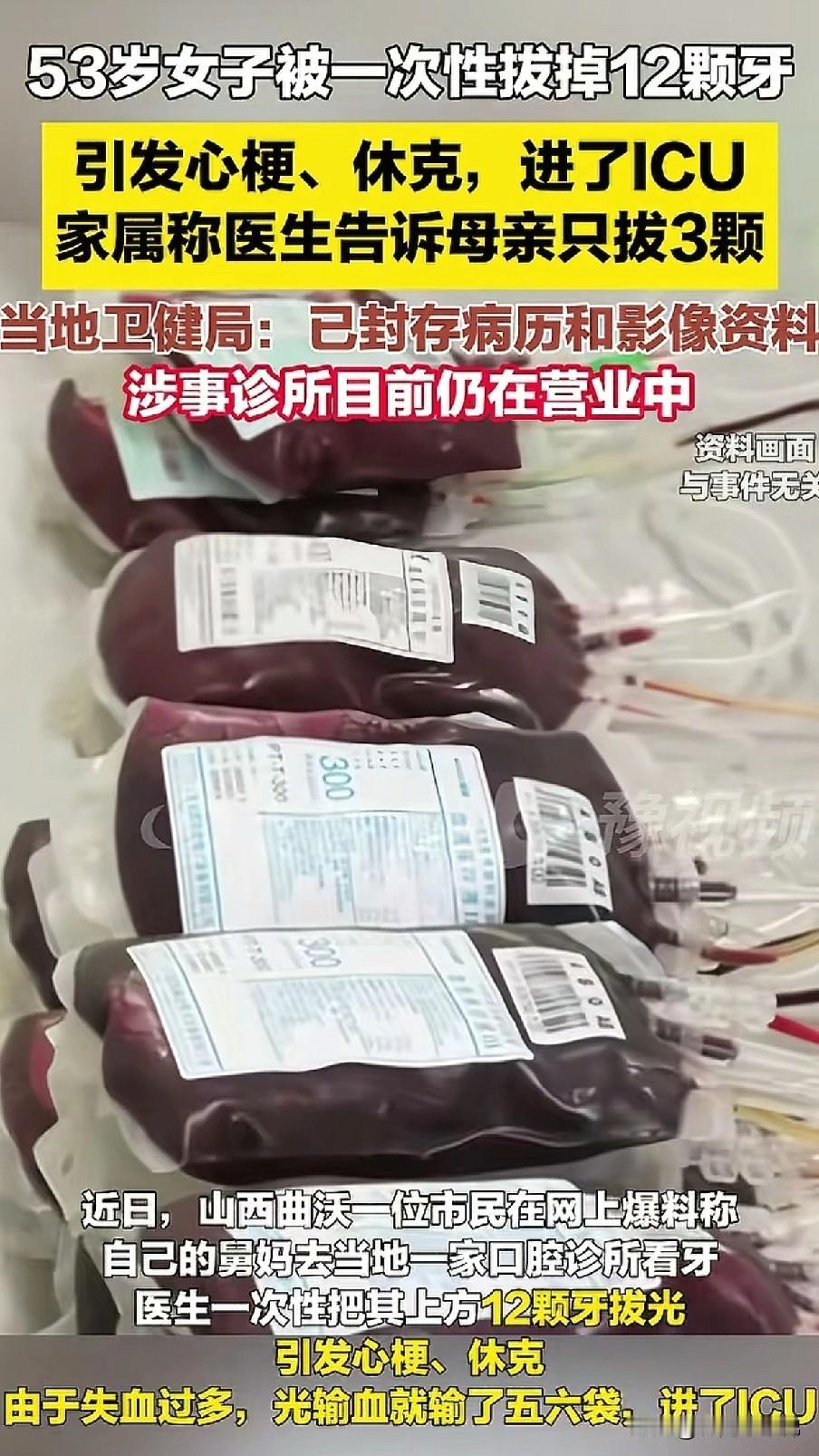 知道的这是拔牙,不知道的还以为是要人命!山西曲沃一位53岁的阿姨,一次性被拔掉12颗牙,失血过多,引发心梗和休克,住进了ICU。 阿姨被抢救过来后,告知自己的儿子小韩,拔牙之前医生告知的只需要拔掉3颗牙。难道拔着拔着拔顺手了?以为是在拔萝卜? 都知道一个人一次只能拔一两颗牙,女性生理期还不给你拔,就怕失血过多。作为有医学常识的牙科医生,不可能不知道这个道理。 并且有人在天眼和企查查上查到,该诊所管理人在今年的1月6号刚刚注销了另一家诊所。而涉事诊所更是因为使用过期药品和被淘汰的医疗设备被处罚过!也说明这家诊所在药品管理方面存在巨大漏洞!竟还能继续正常营业,真是害人不浅!
