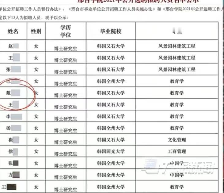 邢台学院也有这样的操作吗,根据报道2022年,邢台学院招聘了13位女博士,这13人均毕业于韩国的大学,这些大学有个特点就是排名靠后,更离谱的是,其中两个人学的是中国学专业,跑到韩国去学中国学,这操作真是让人看蒙了。更让人震惊的是,这里面的多位博士和邢台学院此前的在职教师同名,还有论文作者,信息都一样!有网友质疑,这批博士,是不是就是之前邢台学院里的老师呢!而且韩国又石大学的博士学位很好拿,只需要寒暑假学习2个月,不用语言成绩,入学门槛很低,还是2.5年学制!那这样的博士究竟是什么水平呢,不知道邢台学院接下来如何回复!邢台学院