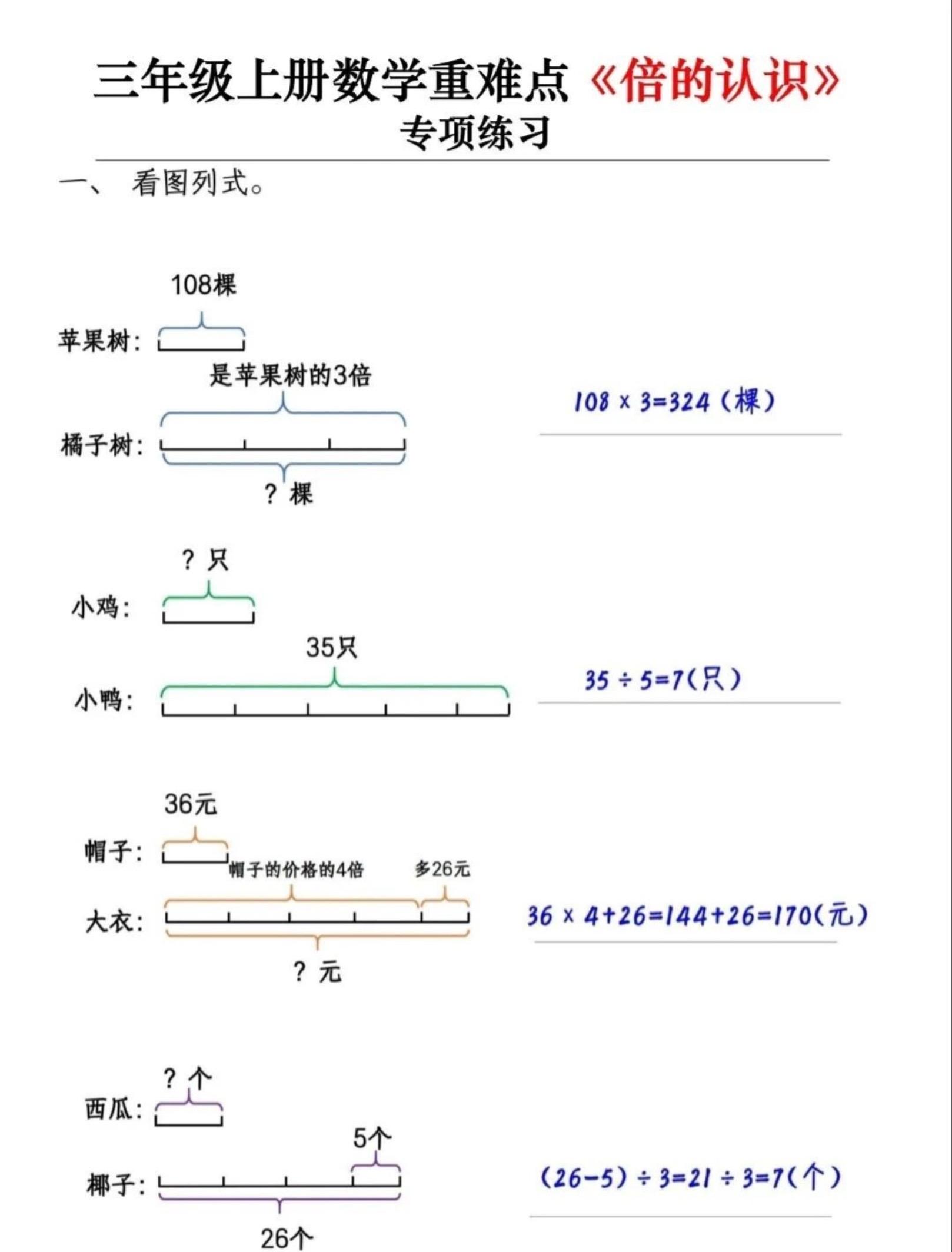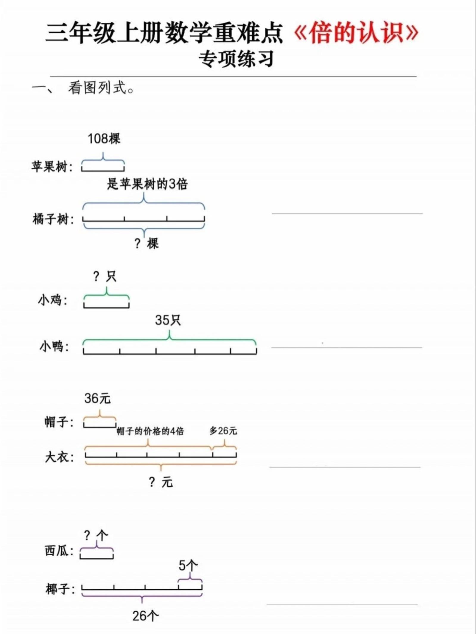 三年级上册数学【倍的认识】例题和练习。有需要可以自行下载打印出来...