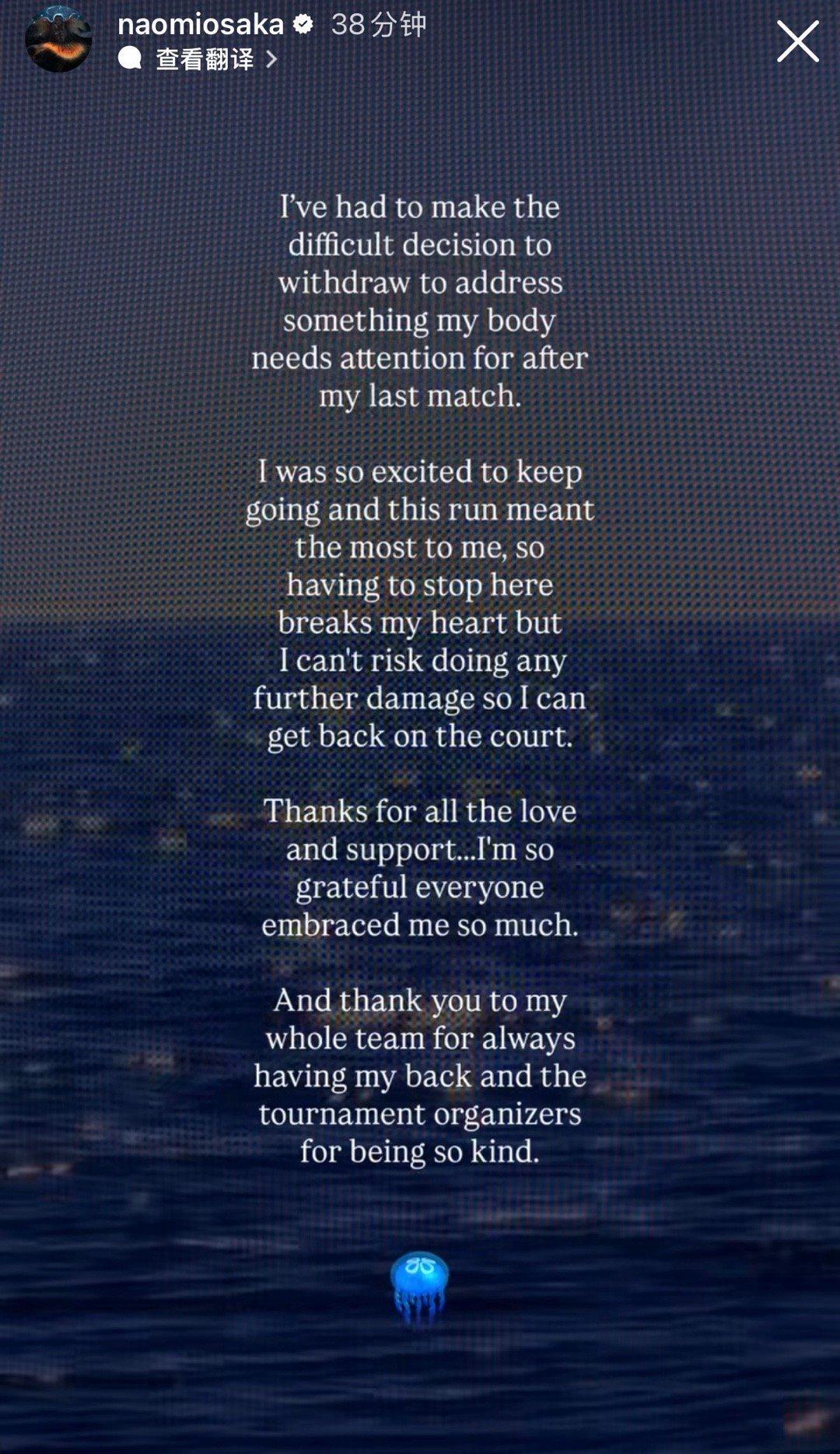 大坂直美退赛!“我不得不做出艰难的决定,退出比赛,以解决我的身体在上一场比赛后需