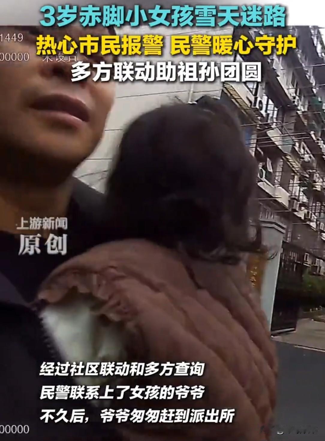上海街头,3岁女孩穿着薄睡衣,光脚踩在地上,冻得直发抖。看见民警走来,她立刻伸出小手喊“抱抱”,谁知,民警却往后退了一步。 这天,上海飘起了雪花,3岁的小女孩扒着窗户看呆了,吵着闹着要去外面玩雪。 她趁着大人不注意,瞧见大门没关严,光着脚丫、穿着薄薄的睡衣就一溜烟跑了出去。 雪粒子落在脸上凉丝丝的,女孩咯咯地笑,踩着地上的积雪蹦蹦跳跳,不知不觉就走远了。 等她玩够了想回家时,环顾四周,全是陌生的街道和楼房。 女孩一下子慌了神,小嘴一瘪,嘴里不停念叨着“爷爷、奶奶”,可喊了半天,也没人回应。 寒风裹着雪花吹过来,她冻得缩起脖子,浑身直打哆嗦,只能一边哭,一边漫无目的地往前走,哭声在空荡的街头格外惹人疼。 恰好有路过的居民瞧见了这个可怜的小家伙,赶紧掏出手机报了警。 没过多久,民警就赶来了。 看到穿着睡衣、光脚踩在雪地里的女孩,正抽抽搭搭地抹眼泪,浑身抖得像筛糠。 见有人靠近,女孩立刻伸出冻得通红的小手,哽咽着喊:“抱抱!” 民警没有立刻抱她,反而后退了一步。 然后,民警脱下自己的内胆外套,小心翼翼地裹在女孩身上,这才一把将她抱进怀里捂热。 因为女孩年纪太小,说不清楚家庭住址,民警只好先把她带回派出所,给她准备了热水和小零食。 之后,民警通过社区联动、调取周边监控,联系上了女孩爷爷。 老话讲“细微之处见真情”。民警后退的那一步,不是冷漠,而是先解孩子的寒冷。一件外套、一个温暖的拥抱,藏着最贴心的善意,这才是实实在在的暖心守护。 为民警的这份细心点赞!