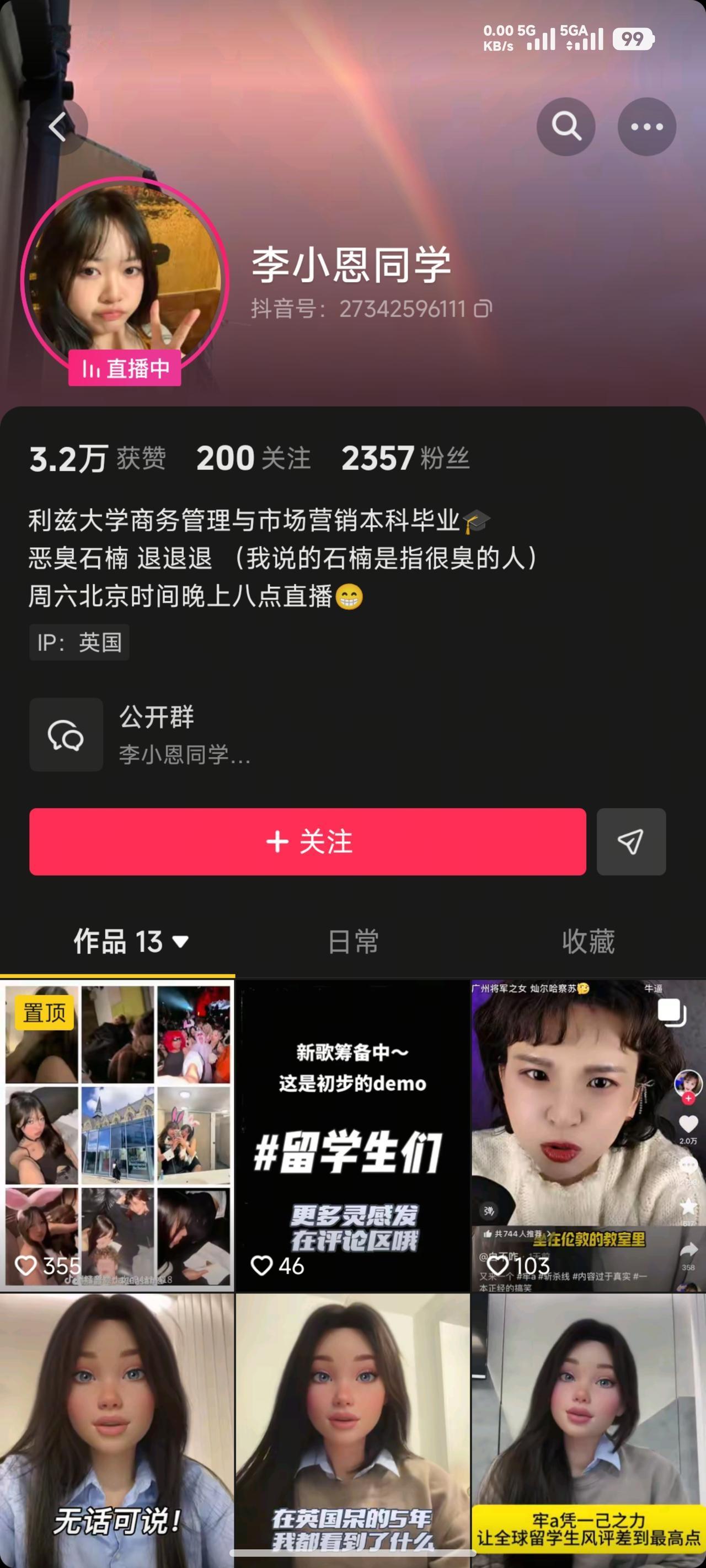 我也亲自去扒了,刚在直播[我想静静] 那个跑去英国学广东话的女留学生被扒了。 她可能没想到自己就怼了牢A几句,结果自己在英国的照片就给扒出来了。而且最重要的是这些照片反而证明牢A说的话千真万确。 就这种兔子装还能说什么呢?比照她2022年在国内的照片你能想象力更大一些吗?