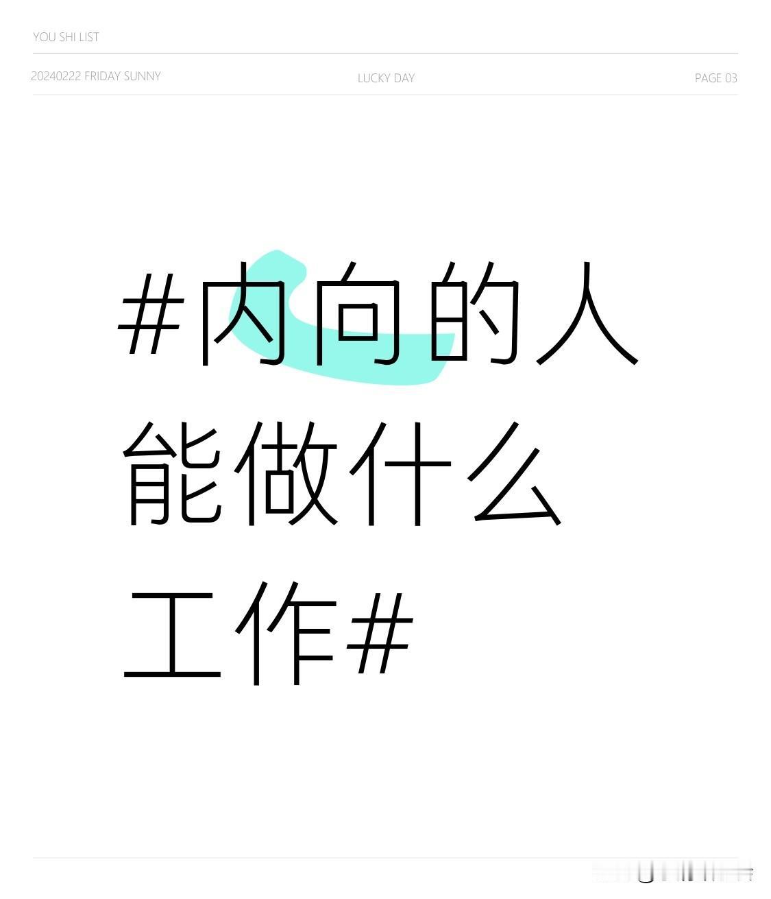 内向的人在职场也有自己的一片天。科研与技术领域就很合适,科研需要长时间专注和深度思考,内向者能沉浸其中。像屠呦呦几十年专注青蒿素研究,内向的程序员也能高效编写代码。 艺术创作领域同样是内向者的舞台,绘画、写作、音乐创作等,他们能凭借丰富内心世界和敏锐感知力产出佳作,村上春树就是典型。 此外,自由职业、技术类工作、创意类工作也不错。社恐女生写网文月入3万,初级数据分析师月薪8K - 15K。内向并非劣势,找准方向也能大放异彩。