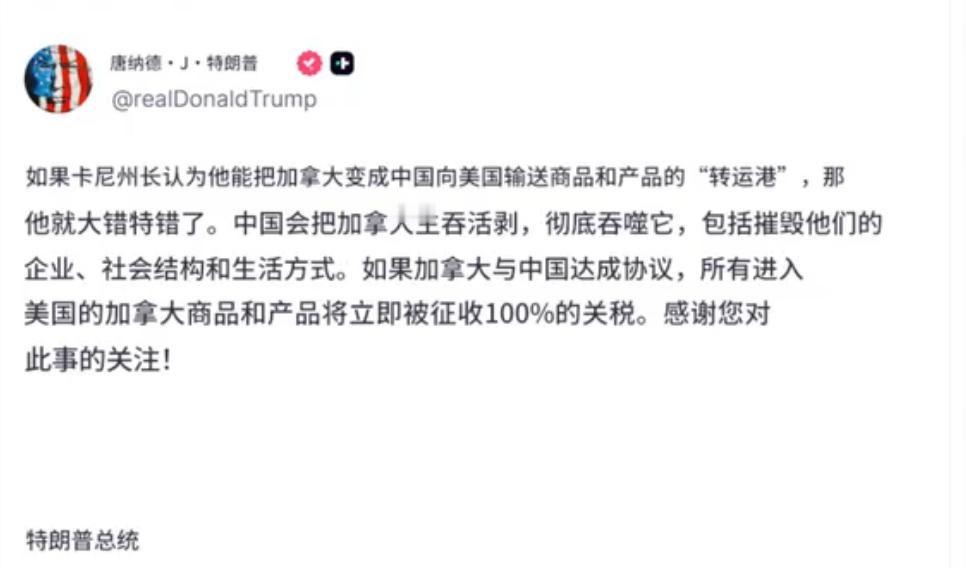 特朗普不愧被称为“川普”,川剧变脸翻脸比翻书还快。头两天还称加拿大与我国达成贸易协议是好事,今天就立马变脸发文称:“如果协议达成,美国将会对加拿大征收100%的关税”。 他之所以会这么做,明面上是担心中国商品会透过加拿大转卖到美国,加拿大有可能成为转运中心。但实际上还是因为加拿大总理卡尼在之前达沃斯论坛上的演讲得罪了特朗普,卡尼在演讲中矛头直指特朗普,不仅坚定支持丹麦,同时还表示基于规则的国际秩序已经名存实亡,呼吁中等国家团结起来对抗霸权。 卡尼的演讲受到欧洲极大欢迎,在网络上也是传播广泛。特朗普在演讲时就曾回击尼道:加拿大应该感谢我们,它之所以会存在是因为美国。不解气的他在回国的飞机上继续发文抨击卡尼:我收回邀请你加入“和平委员会”。 看得出特朗普对卡尼很生气,摩根大通CEO因为在论坛是上得罪了特朗普,转头特朗普就起诉了摩根大通要求赔偿50亿美元。得罪了小心眼的特朗普,此番加拿大怕是日子也不会好过。
