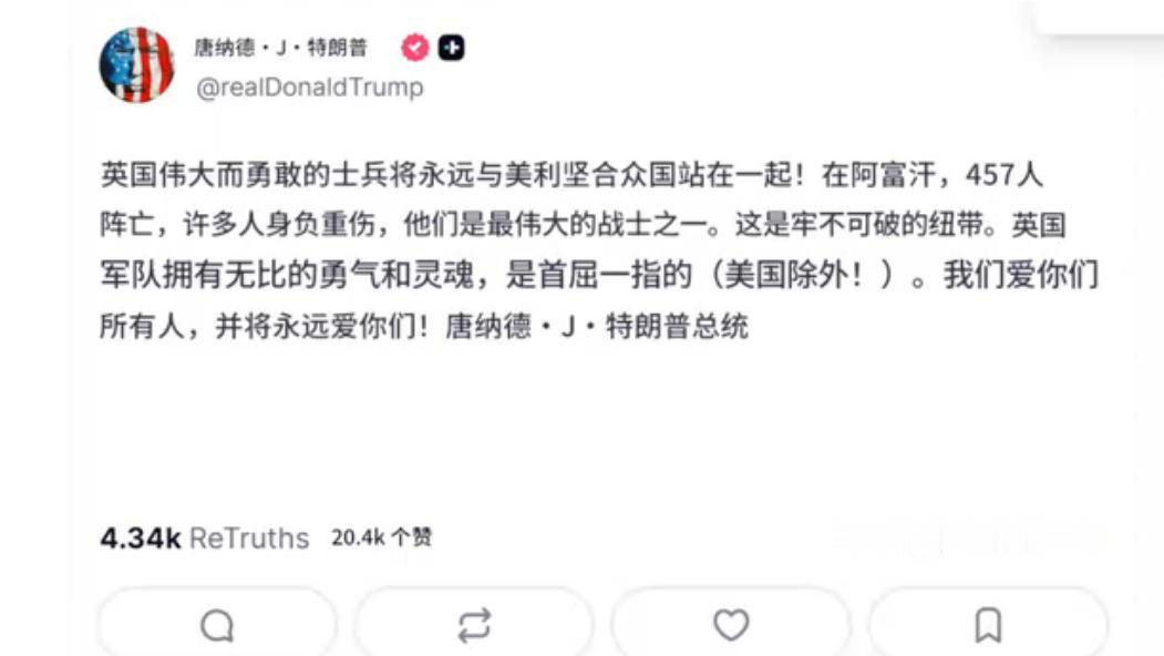 你不得不佩服特朗普的灵活,即使前后矛盾但从不脸红内耗。头一天接受采访才调侃北约军队在阿富汗时总是躲在美军后面,本想羞辱一下欧洲,没想到伤到了在阿富汗也付出巨大代价的好朋友英国,首相斯塔默直言这是一种侮辱。 感觉不小心伤到好朋友的特朗普隔天立马换了副嘴脸,发文夸赞起了英军在阿富汗的英勇表现,称赞英军拥有无与伦比的勇气和灵魂。特朗普翻手为云覆手为雨的能力还真是一绝,只是不知道英国被伤到的幼小心灵能不能咽下这口气。