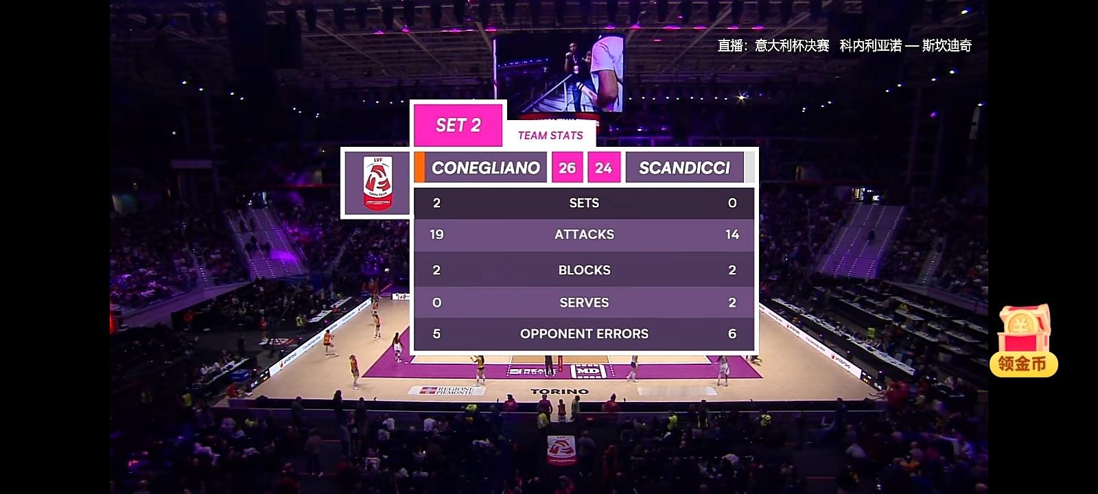 意大利杯决赛,科内利亚诺26比24再取胜第二局,第二局也是跌宕起伏,朱婷开局和局