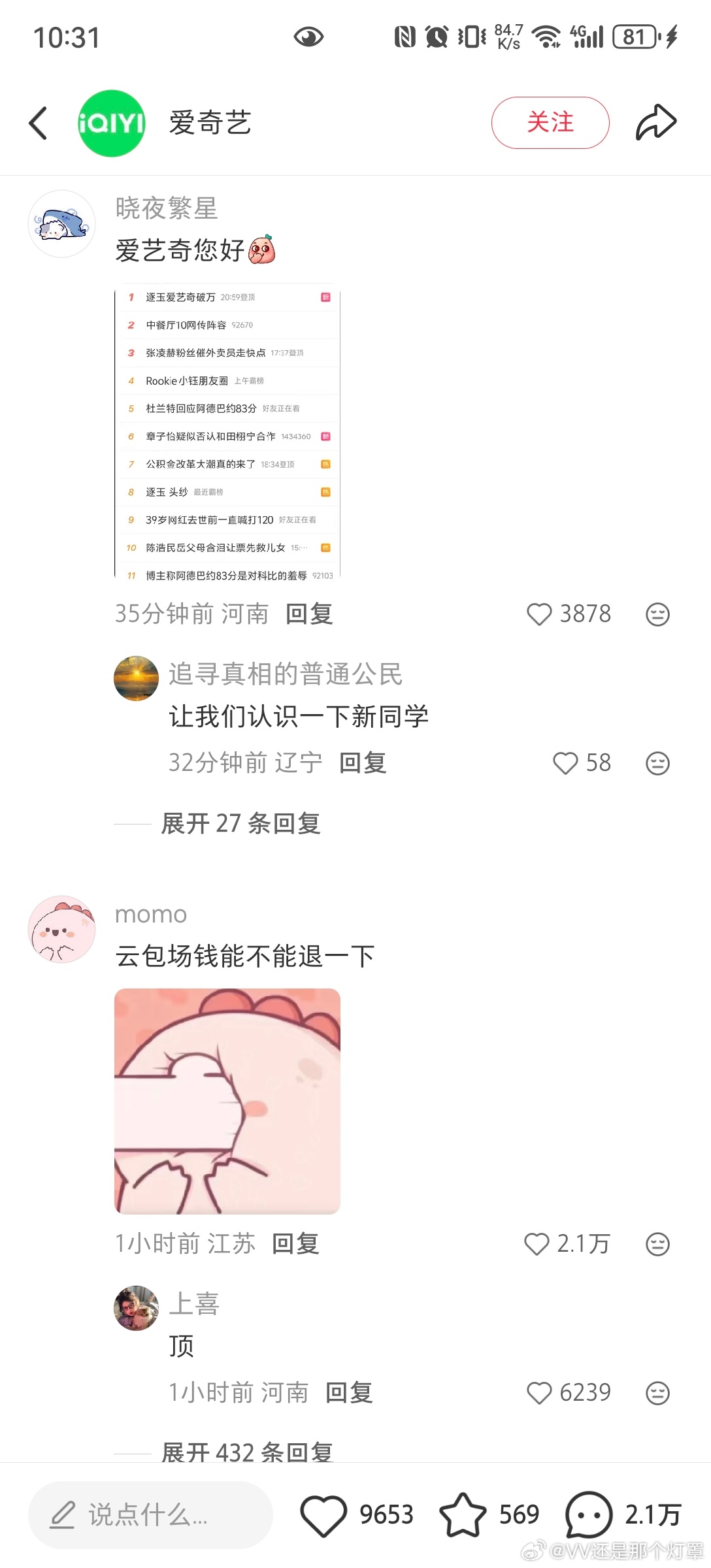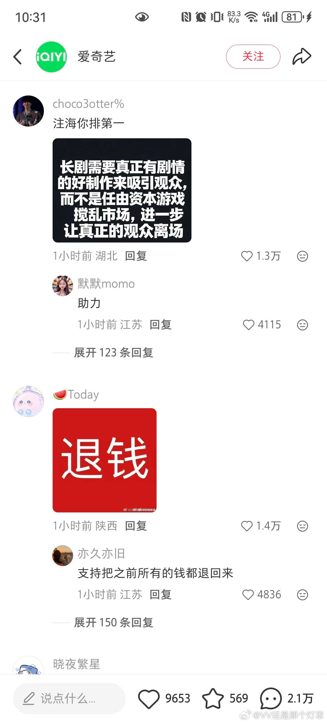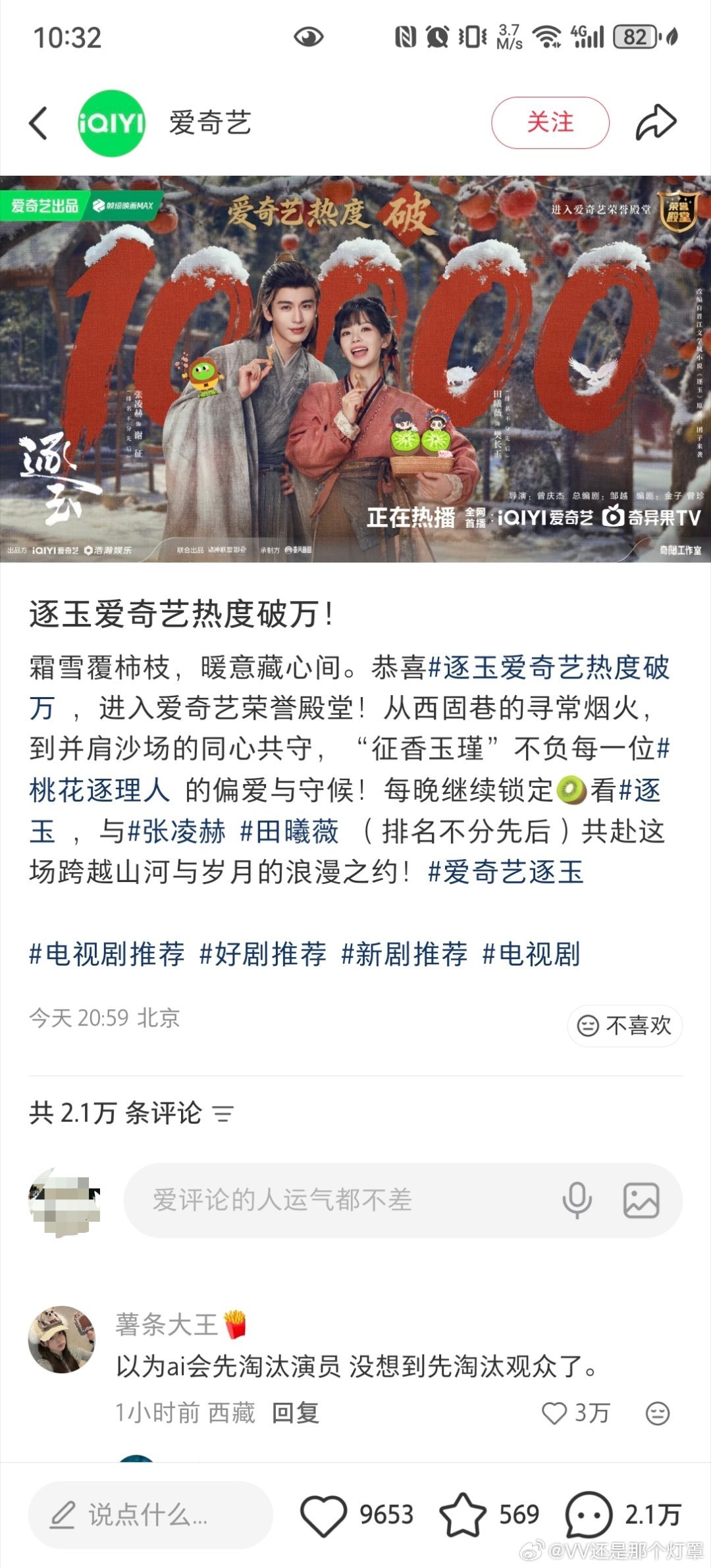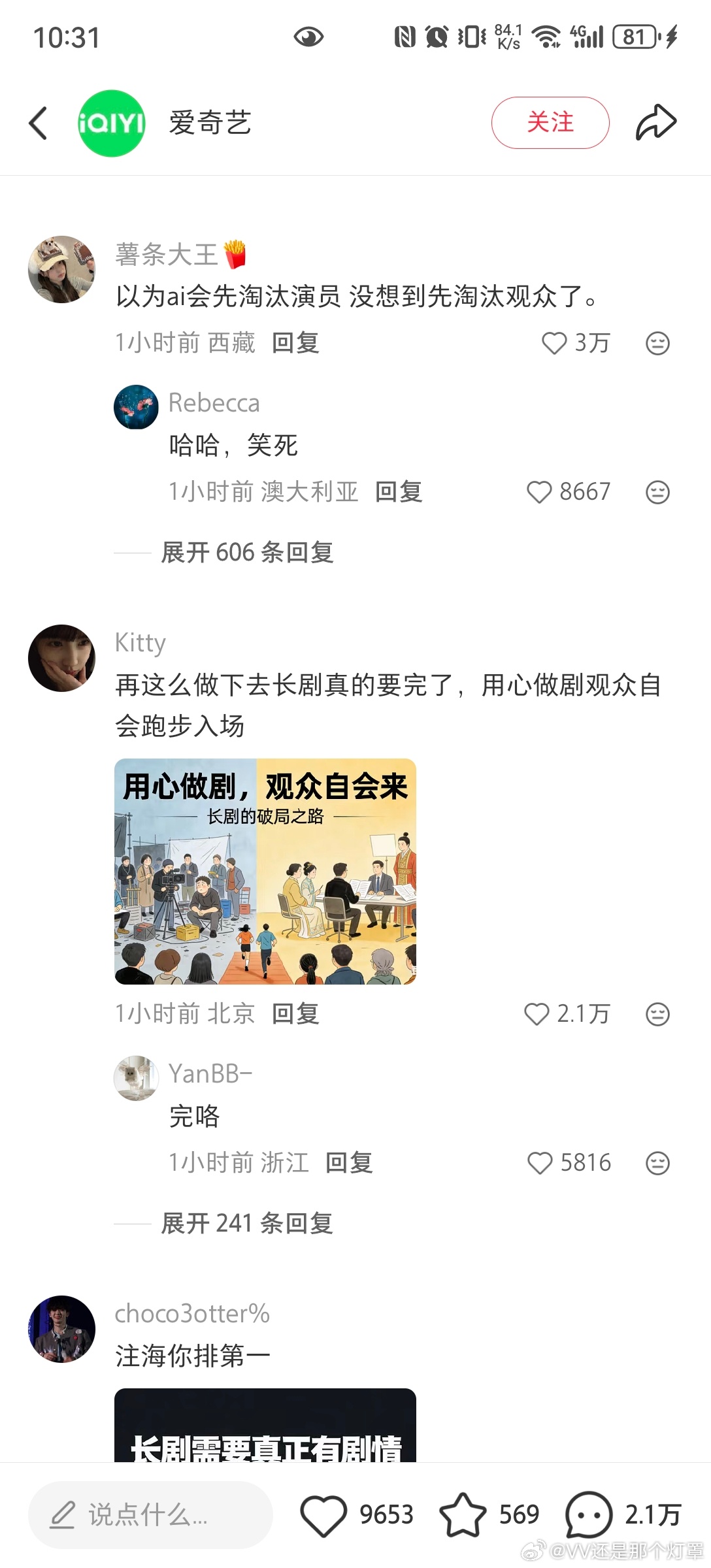 下沉市场比微博反应更激烈。🍠那边爱奇艺发的逐玉破万帖主帖赞才9000多,评论却有2w+,热评第一金句“以为ai会先淘汰演员 没想到先淘汰观众了”内赞3w+,划了十几页几乎全是路人嘲讽,且一直持续增评中。逐玉双平台破万