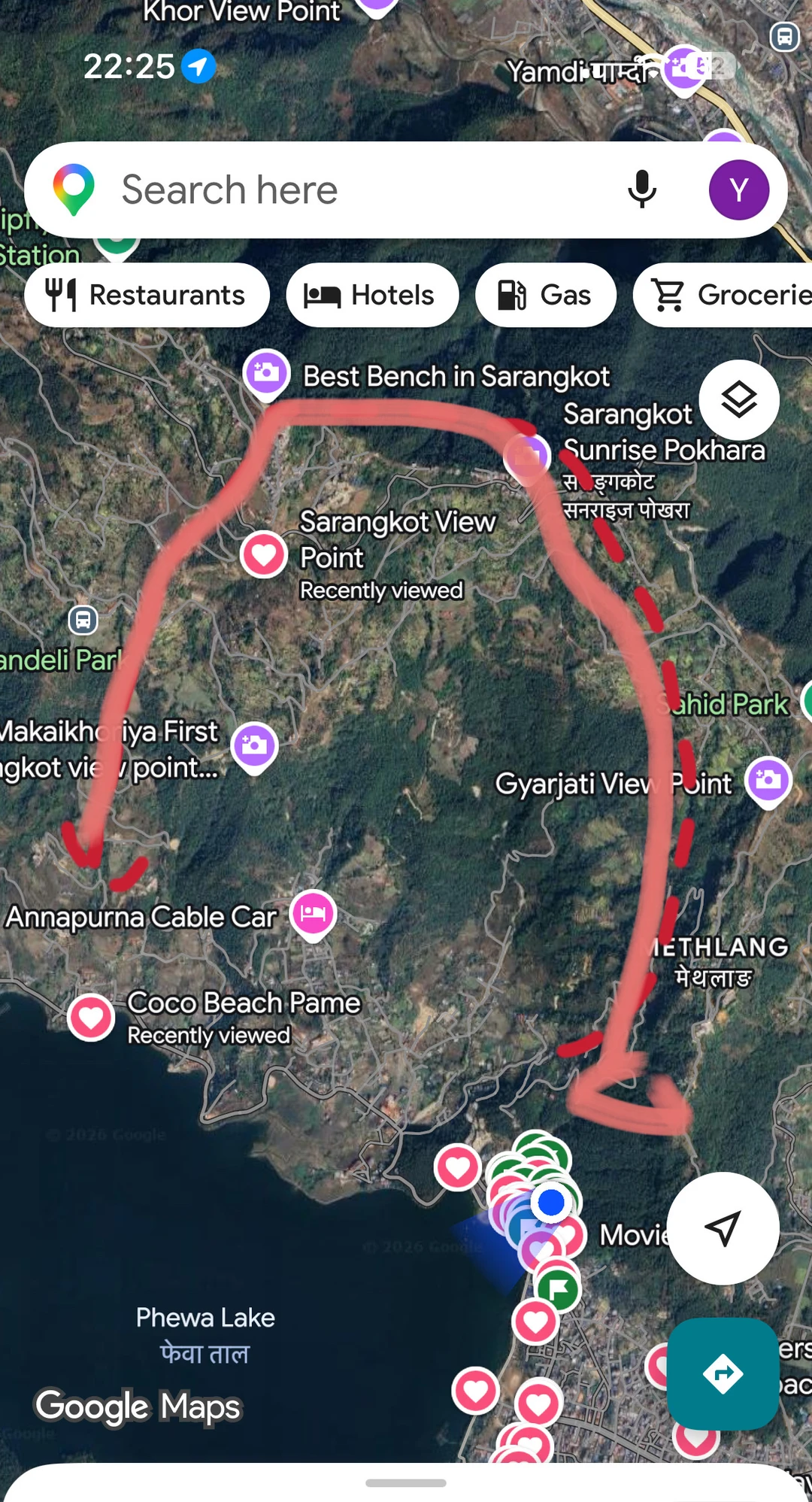 从20街区的起点:Pyramid Yoga Pokhara,这边一个位置甚好的观景点,是一座藏传佛教的寺庙,从寺庙沿着后山走,🈶一个明显的小路,沿着左手🫲的方向,小路尽头就是Sarangkot的主路汇合,之前🈶看到帖子说是先打车🚗到Monkey garden ,其实从