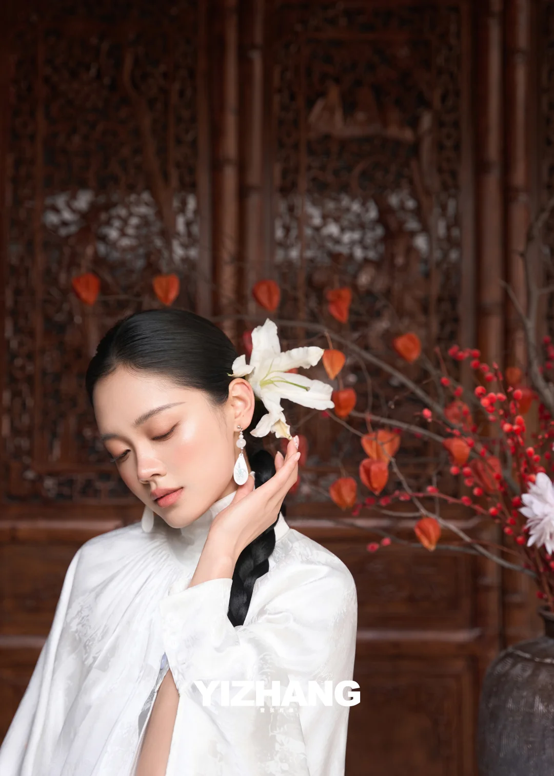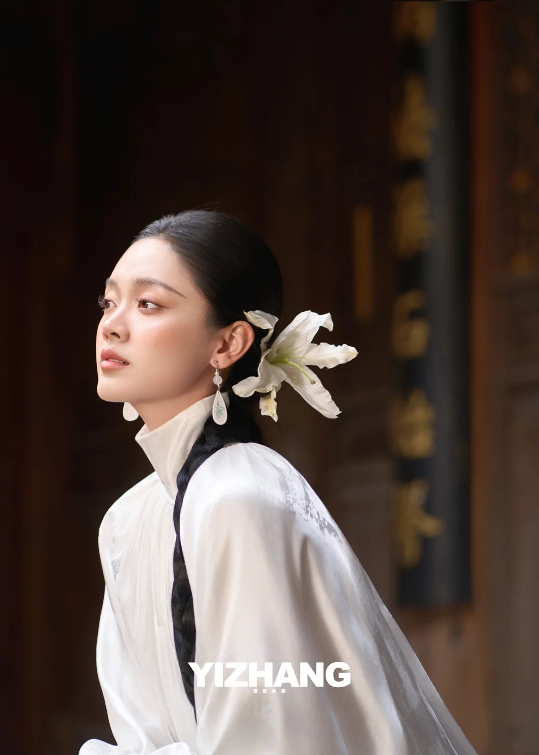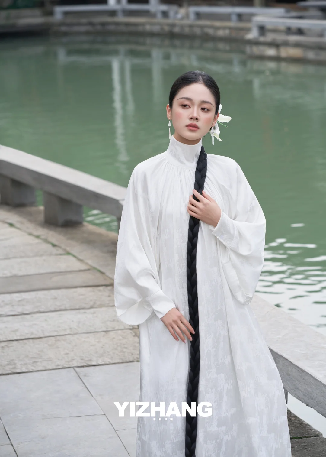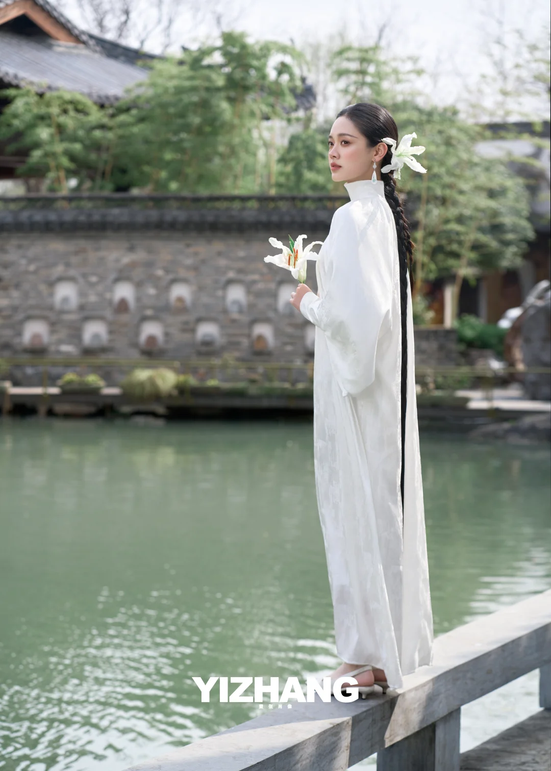 一袭素白长裙,搭配垂到脚踝的粗麻花辫,鬓边别着一朵洁白的百合🌿,温婉又清冷,完全是从江南水墨画里走出来的女子!