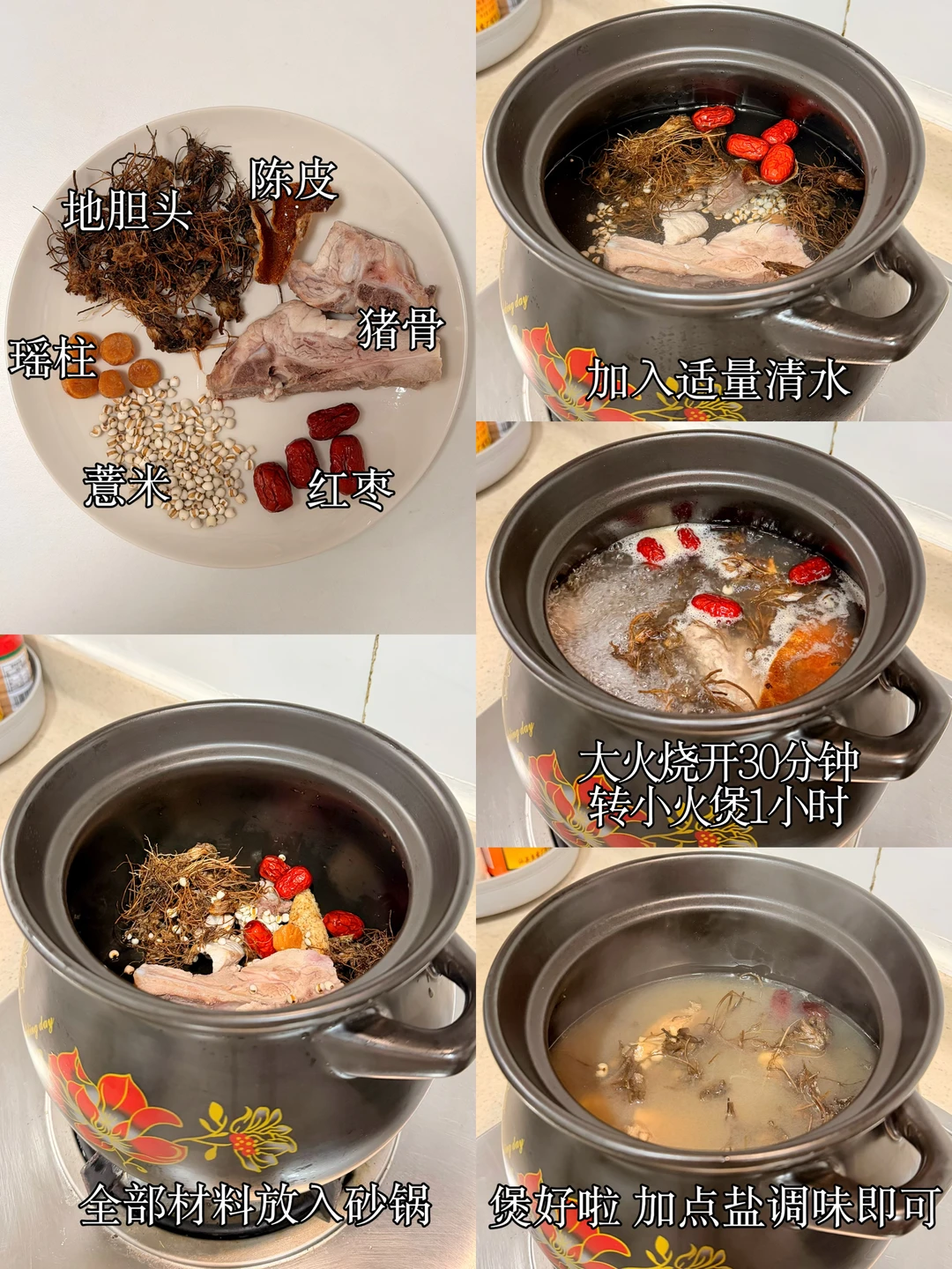 地胆头20克、陈皮1瓣、红枣5颗、瑶柱几颗、薏米30g、猪骨500g