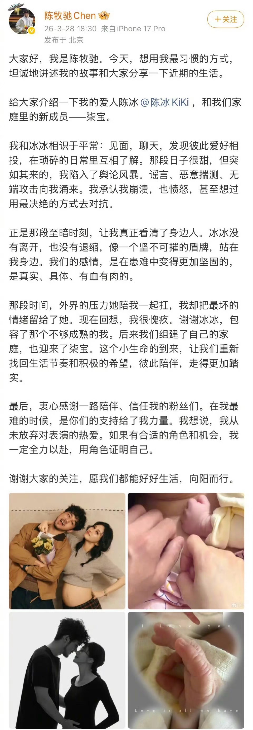 陈牧驰长文宣布和陈冰结婚,并且已经生娃了! 陈牧驰陈冰官宣结婚生子
