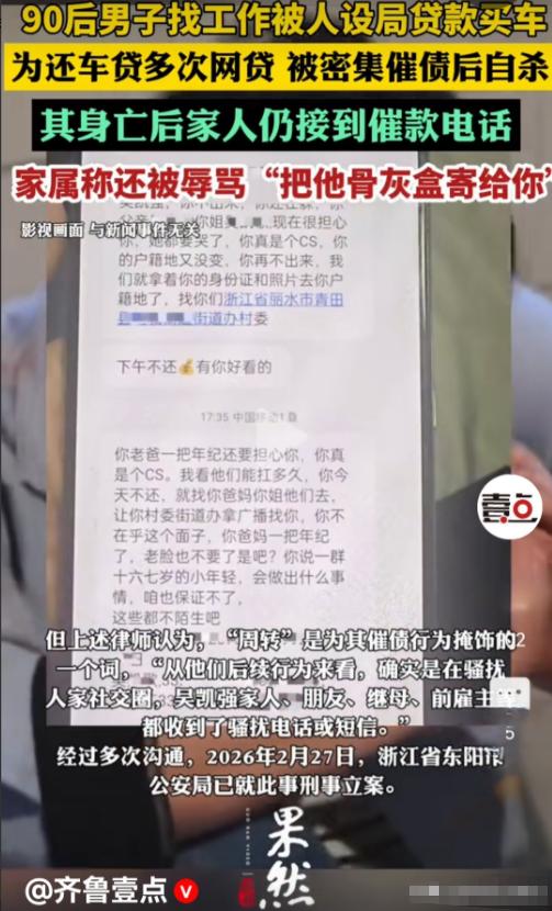 浙江东阳,33岁的男子,在母亲长眠的公墓旁,在车里结束了生命。而悲剧的开始,以为能找到月入过万的司机工作,不料,却掉进了“贷款买车”的陷阱,最终男子被无休止的催债,逼上了绝路。最让人难以接受的是,男子死后,家人还接到催收电话,被辱骂:“把他骨灰盒寄给你”。