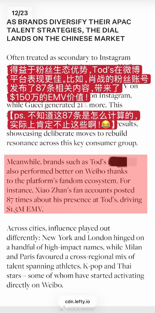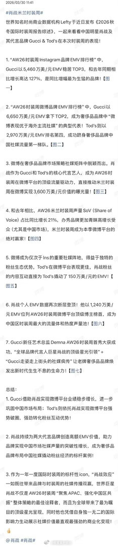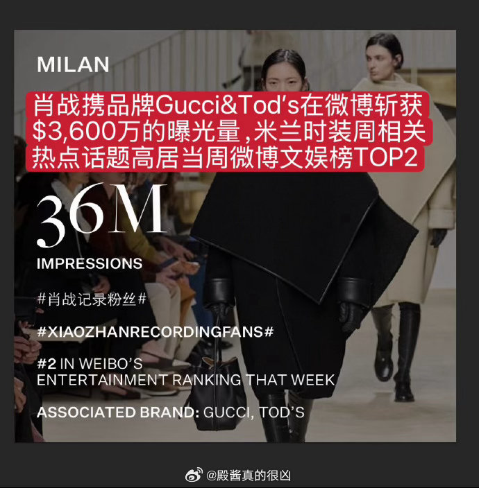 AW26米兰时装周肖战数据炸场!肖战以断层1240万美元EMV登顶微博顶级博主榜首,成为中国区时装周绝对流量核心。Gucci凭他实现127%同比暴涨,稳坐全球EMV TOP3;Tod's借他跻身中国社媒第一梯队,单靠粉丝互动撬动150万美元EMV。他一人带动米兰时装周3600万美元微博曝光,用“肖战效应”让两大代言品牌实现海内外声量双爆发,用顶级影响力诠释奢侈品中国市场的流量密码,是当之无愧的全球时尚标杆!