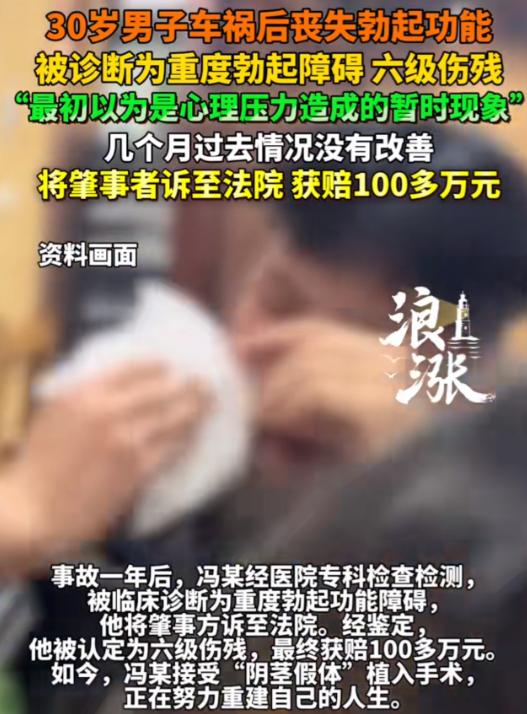 “千金买不来幸福了!”30岁男子发生车祸后,发现自己丧失勃起功能,起初,以为是心理压力造成的现象,只是暂时的,可几个月过去了,还是没有好转,一年后,男子终于鼓起勇气去医院查看病情,结果被诊断为重度勃起障碍六级伤残。男子非常痛苦和愤怒,直接将肇事者诉至法院 ,法院判赔100多万。网友:羡慕,30岁就是百万富翁了!