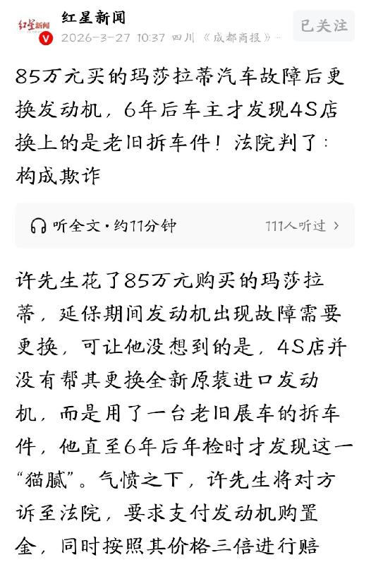 妥妥的欺诈!江苏盐城,男子花85万买了辆豪车。谁知,延保期间,发动机突然出现故障,他赶紧到4S店更换了发动机。当时店方承诺,更换的发动机绝对是全新原装,谁知6年后,男子竟发现,4S店给他换的根本不是新的,而是从其他车上拆下来的旧件。这是妥妥的欺诈,男子怒了,将4S店告上法庭,要求退一赔三。