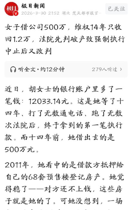 这14年,她跑遍当地所有法院和相关部门,耗尽全部精力,只为追回全家赖以生存的500万血汗钱,可最终到账的只有12033.14元,连当初承诺利息的零头都不够,积压多年的委屈在这一刻彻底爆发。