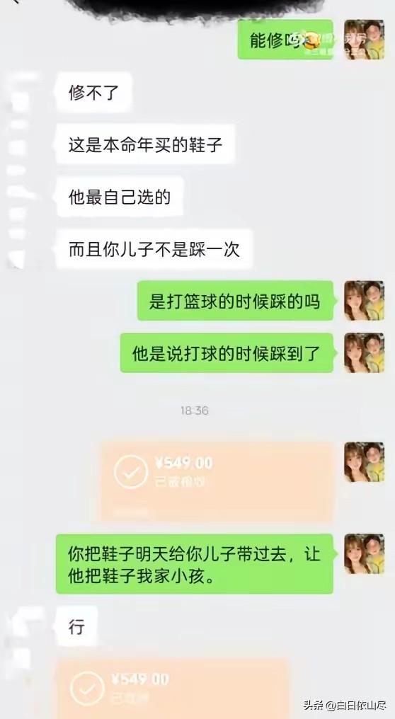 这位家长本身性格比较爽快,也觉得自家孩子不小心踩到别人鞋子,造成损坏理应承担责任,没有过多纠结赔偿金额,也没有要求先查看鞋子的损坏情况,就直接按照对方的要求,转账赔付了五百多元。同时,她特意叮嘱对方,让孩子第二天把那双被踩坏的篮球鞋带回学校,交给自己的儿子。
