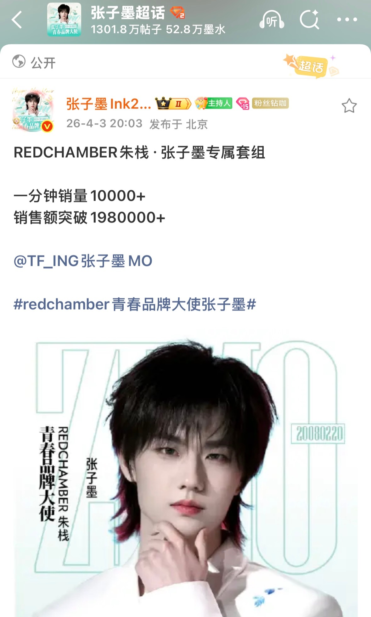 张子墨秒切200万 张子墨首个商务30秒销量破万,秒切销售额突破200万,品牌下