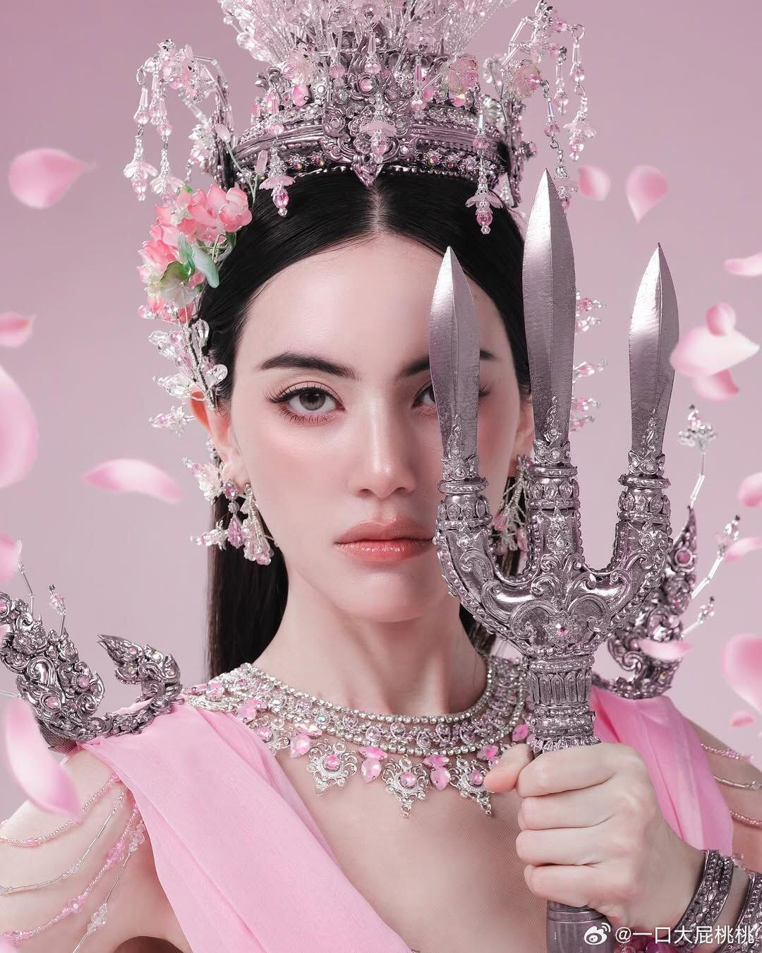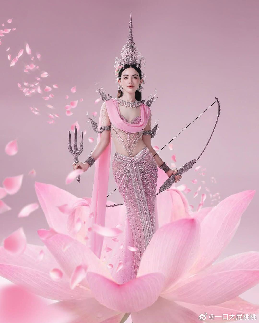 演绎了传统文化中的“Mahothorn Devi”,她选择了一套粉色与银色为主调的改良泰式服饰,每年的泰国新年(宋干节),除了泼水大战,最隆重的仪式感非“花车女神巡游”莫属,她们通常由当红女星或选美冠军扮演。