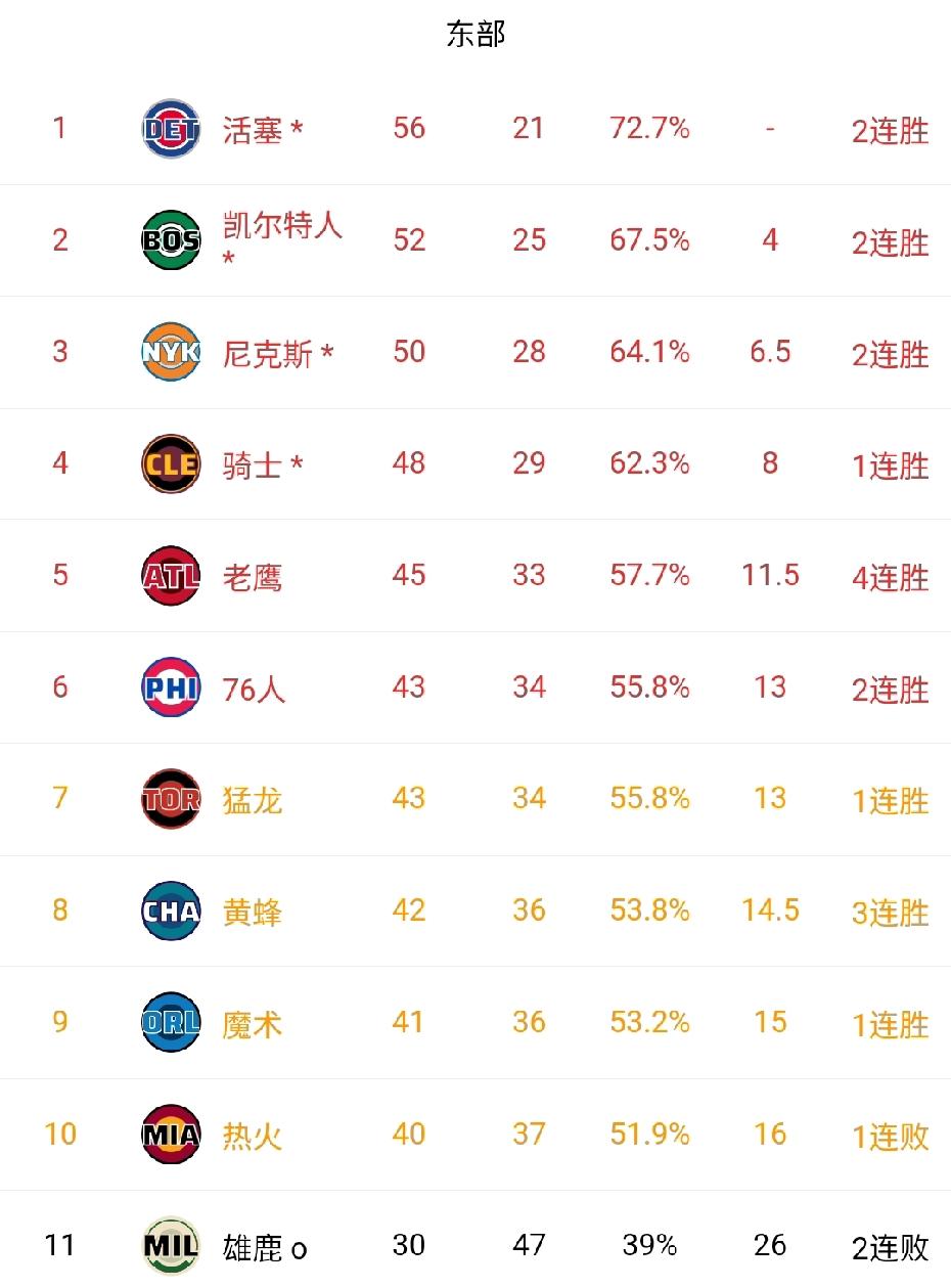 东部前六至今未能锁定,除了热火稳居第10,其它队都在争胜就为了季后赛名额。76人与猛龙的6、7名悬念最大。