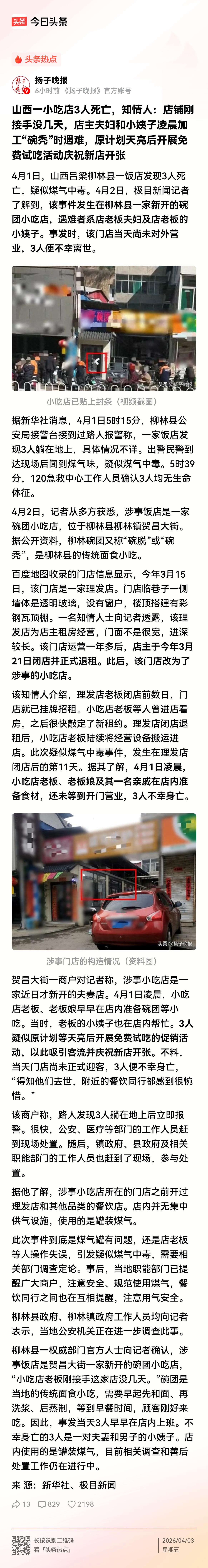 山西一处沿街店面外,警戒线围起了一片区域,路过的人纷纷驻足叹息。谁也没想到,这家还没正式营业的小店,竟成了3条生命的终点——夫妻俩盘下店面后,凌晨忙着准备食材,连同前来帮忙的小姨子,一同不幸身亡,初步判断疑似煤气中毒,目前相关调查仍在进行中。