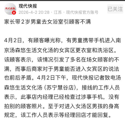 南京,女子在澡堂洗澡,一家长带2岁男童进入女浴,女子犯膈应。无独有偶,另一女子洗澡时,碰到一6岁男童进入,手里还拿着手机,女子担心被拍到,告知搓澡阿姨,搓澡阿姨说:我只负责搓澡,这事不归我管。两名女子都窝了一肚子火,一并报警维权。结果澡堂的态度,让她们失望至极。网友:才2岁懂什么,太矫情了! 南京一名女子平时工作繁忙,难得有一天休息时间,便特意选了家离家不远、口碑还不错的澡堂,想着好好洗个热水澡,缓解连日来的疲惫。 她换好浴服,走进女浴区后,找了一个相对隐蔽的淋浴间,刚脱完衣服准备打开热水,就听到身后传来脚步声和家长的叮嘱声,回头一看,一名中年家长正带着一个2岁左右的男童,毫无顾忌地走进了女浴区。 那个2岁男童穿着小小的浴裤,好奇地四处张望,眼神毫无避讳地在各个淋浴间之间游走,时不时还会伸出小手,指着周围的环境咿咿呀呀地说话。 她本以为这只是偶然发生的一件事,想着忍一忍就过去了,洗完澡赶紧离开就好。可没想到,等她洗完澡,擦干身体换好衣服走出淋浴区时, 竟遇到了另一名同样满脸怒气的女子,两人眼神交汇,都从对方脸上看到了委屈和不满,一番交流后才知道,彼此竟然有着极为相似的遭遇,都是在洗澡时被男童闯入,破坏了原本安心的洗澡体验。 另一名女子比她早来一会儿,当时正躺在搓澡床上,让搓澡阿姨给自己搓澡,身上只盖着一块薄薄的搓澡巾,毫无隐私可言。 就在这时,一个6岁左右的男童突然从女浴区门口闯了进来,手里还紧紧攥着一部智能手机,手指在屏幕上时不时低头摆弄着,屏幕亮着,隐约能看到拍照界面,疑似在随意拍摄浴区里的画面。 女子瞬间慌了神,心脏猛地一紧,生怕自己的隐私被拍到,赶紧用搓澡巾裹紧身体,一边示意男童赶紧出去,一边急忙喊来正在给自己搓澡的阿姨,把男童闯入、手持手机疑似拍摄的情况告诉了她,希望搓澡阿姨能出面制止,把男童带出去,避免自己的隐私受到侵犯。 可搓澡阿姨听到后,只是淡淡看了一眼门口的男童,没有丝毫要起身处理的意思,依旧低着头干着自己的活,手上的动作也没有丝毫停顿,只含糊地应付了一句,示意自己的工作职责就是搓澡,负责给客人做好搓澡服务,至于男童闯入、疑似拍摄的事情,不归她管,让女子自己想办法处理。 女子心里的火气瞬间上来了,既生气男童闯入、疑似拍摄,更生气搓澡阿姨的冷漠和推诿。她无奈之下,只能自己起身,走到男童面前,轻声劝说他赶紧离开女浴区, 可男童根本不听劝,依旧拿着手机在浴区里闲逛,时不时还会对着淋浴间的方向张望,女子上前想轻轻拉他出去,他还用力挣脱,哭闹着不肯走。 两名女子碰面后,越想越气,她们找到澡堂负责人后,详细说明了自己的遭遇,明确提出了自己的诉求: 希望澡堂能公开道歉,加强浴区的管理,安排专人在浴区门口值守,禁止异性儿童闯入,同时对涉事的搓澡阿姨进行批评教育,避免以后再出现类似的情况,保护好顾客的隐私。 可澡堂负责人的态度十分消极,全程都是一副敷衍了事的样子,既没有认真倾听她们的诉求,也没有给出任何有效的解决方案, 只是轻描淡写地解释说,家长带年幼的孩子进入浴区也是没办法的事情,男童年纪还小,什么都不懂,让两名女子多担待一下,不要太过计较,甚至暗示是她们小题大做,太过敏感。 这样的回应彻底点燃了两名女子的怒火,她们觉得自己的合理诉求没有得到丝毫重视,作为消费者,花钱来澡堂洗澡,本该拥有安全、私密的环境, 可现在不仅隐私受到威胁,还被澡堂工作人员轻视、敷衍。反复沟通无果后,两人只能选择报警维权,希望通过警方的介入,让澡堂重视此事,给自己一个合理的说法,维护自己的合法权益。 民警赶到现场后,立即展开调查,分别向两名女子、澡堂工作人员、搓澡阿姨以及当时在场的其他顾客了解了事情的全过程,同时查看了澡堂浴区门口和内部的监控录像,逐一核实了事件的细节。 事件相关细节在网上传开后,网友们瞬间吵翻,分歧十分明显。有一部分网友觉得,2岁的男童年纪太小,根本不懂什么是隐私,家长带他进入女浴区也是出于无奈,两名女子太过矫情,没必要因为这点小事斤斤计较; 但更多网友表示反驳,再小的男童也是异性,女浴区是专属女性的隐私场所,家长不该只顾自己方便,忽视他人的感受,而澡堂的失职和敷衍,更是难辞其咎。 对此,你们有什么看法,欢迎评论留言~