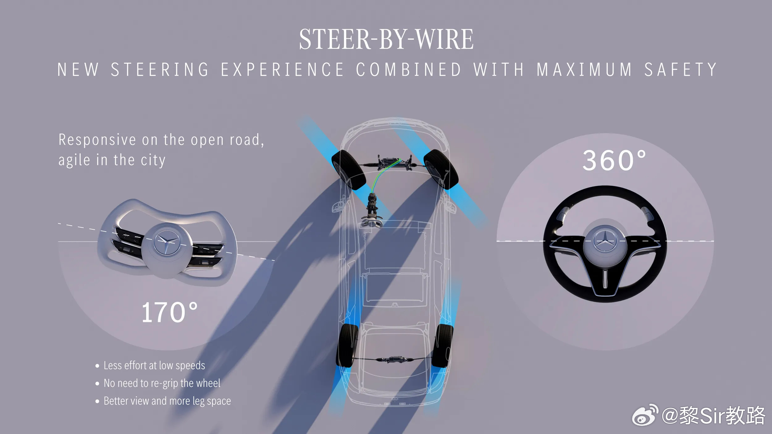 奔驰的Yoke方向盘要来了,也意味着线控转向也搭载。在低速下,极左和极右绝对是一把内完成,左右加起来才170度。