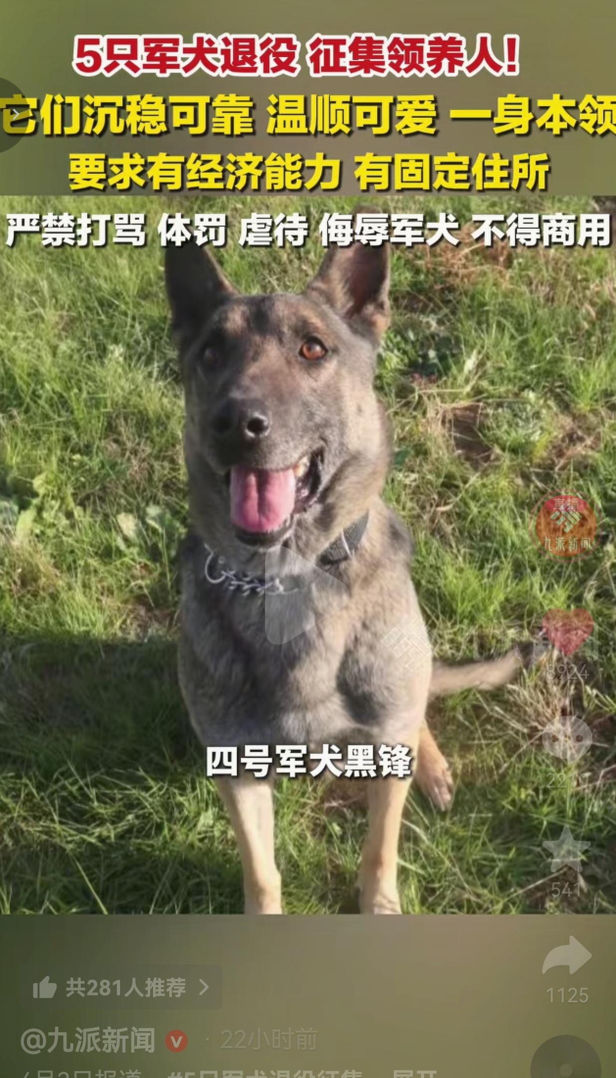 还有的网友说:求求了,别让这些功臣老了无家可归!它们用一辈子守护我们,我们也得用一辈子守护它们!领养一定要严格审核,别让坏人钻空子!