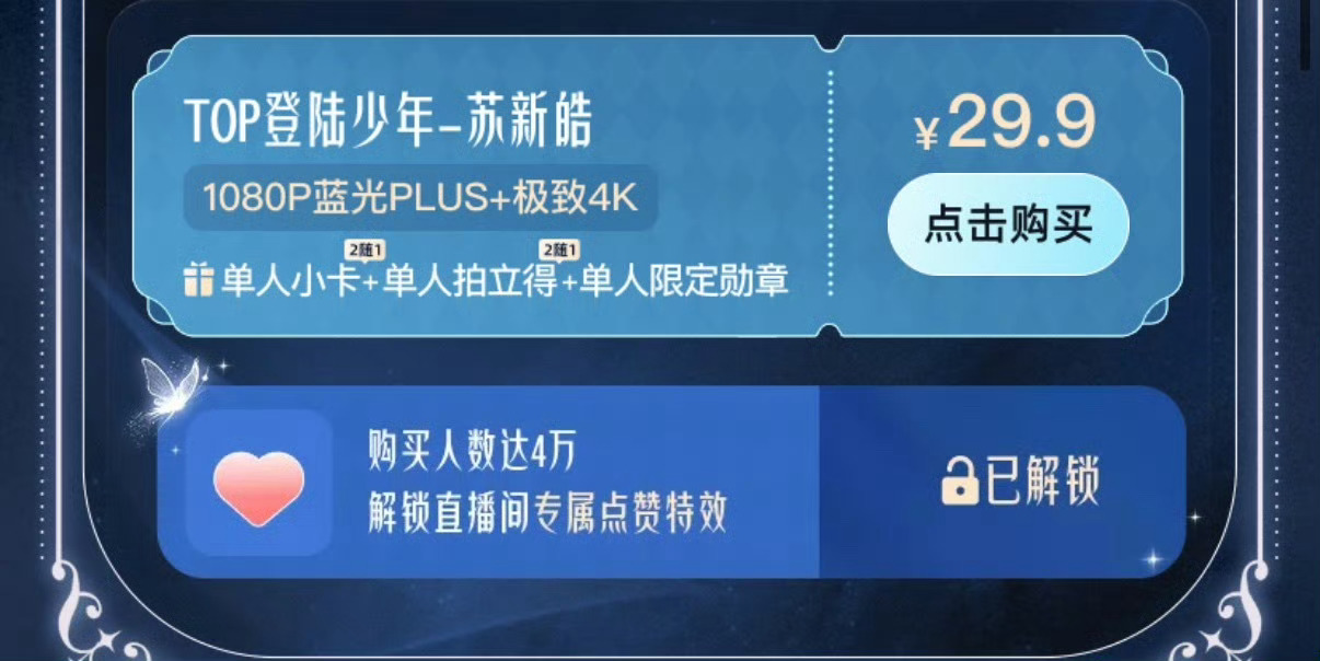 苏新皓演唱会个人直拍机位销量达4万 第一个解锁专属点赞特效🎉苏新皓也是第一个破