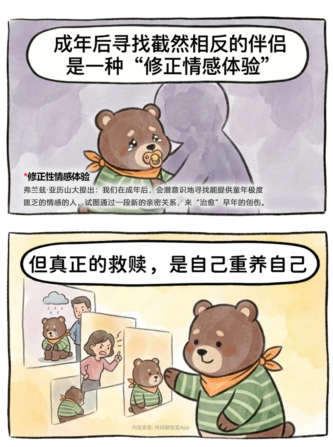 意思是说:我们在成年后,会潜意识地寻找那些能提供我们童年极度匮乏的情感的人,试图通过一段新的亲密关系,来“治愈”早年的创伤。