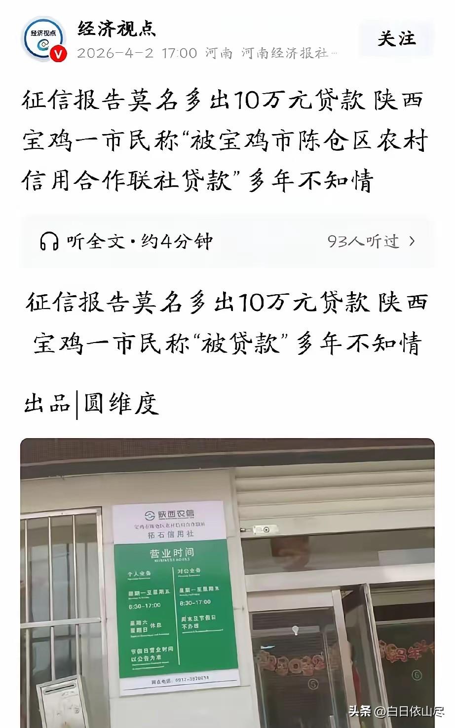 太离谱!陕西宝鸡,男子准备买套房,购房前,他去打印征信报告,谁知竟然发现,自己名下有一笔7年前的10万元贷款记录,已经逾期。男子顿时懵了,自己从没有办过贷款,贷款合同上却有他的签名、收银和面签照片。更离谱的是,贷款发放的时间,比自己办理存折的时间早了整整四个月。男子找到银行讨要说法,谁知,银行的态度让他无语。 2026年初,陕西宝鸡的李先生筹备买房,按流程前往网点打印个人征信报告,原本笃定自己无任何借贷记录,能顺利办理房贷。可拿到报告的瞬间,他彻底懵了,原本清晰的征信上,赫然出现一笔7年前的10万元贷款逾期记录,这份突如其来的负面信息,瞬间打乱了他所有的购房计划,也让他陷入了莫名的困扰之中。 征信报告明确显示,这笔贷款发放于2018年2月,金额10万元,贷款期限一年,早已逾期且未结清,直接给李先生的征信留下了严重不良记录。李先生反复确认,报告上的姓名、身份证号均为本人信息,可他对这笔贷款毫无印象,长这么大从未向任何银行申请过贷款,也没有帮他人做过担保,名下怎么会凭空出现一笔逾期贷款,他怎么也想不通。 为了弄清真相,李先生第一时间梳理自己2018年的生活轨迹,那段时间他一直在本地务工,日常只用工资卡收支,从未接触过任何贷款业务,也从未将身份证、银行卡出借他人,更没有签过任何贷款相关的文件。排除了自身所有可能后,他确定这笔贷款绝非自己办理,而是在完全不知情的情况下,被人冒用身份办理的。 带着满心疑惑,李先生来到涉事银行,要求调取这笔贷款的全部原始档案,银行在他多次沟通后,才提供了当年的贷款资料。李先生翻看后发现,贷款合同上有他的签名和红色指印,还附有一张面签照片,可这些所谓的“本人材料”全是伪造的,签名笔迹和他本人完全不符,指印也并非他所按,那张面签照片他更是从未见过,根本不是他本人办理业务的画面。 更让人觉得荒谬的是,李先生核对贷款放款账户时,发现了一个无法辩驳的核心漏洞。这笔10万元贷款的发放时间是2018年2月,而对应的收款存折,开户时间却是2018年6月,贷款比存折开户早了整整四个月。按照银行正规贷款流程,必须先开立有效账户才能放款,账户还没办,贷款就已经发放,这完全违背了基本的业务规范,明显是违规操作。 李先生拿着这个关键漏洞,再次找到银行讨要说法,要求银行核查当年办理流程,鉴定签名和指印真伪,同时撤销逾期记录、修复征信。可银行的态度却十分消极,工作人员先是以时间久远为由,推脱难以查找监控和操作记录,对李先生的合理诉求含糊回应,既不开展内部核查,也不给出明确的解决方案,全程没有主动推进问题处理。 接下来的日子里,李先生多次往返银行沟通,放下手头工作专门处理此事,可每次都得到等待回复的答复。银行既不承认业务审核存在疏漏,也不配合李先生的维权诉求,对他提出的笔迹鉴定、追责等要求一概回避。因为这笔莫名的逾期贷款,李先生的房贷无法办理,购房计划被迫搁置,房东也开始催促,他的生活被彻底打乱,满心无奈却又无处说理。 无奈之下,李先生整理好征信报告、贷款资料、存折开户与贷款时间对比等所有证据,向当地金融监管部门提交投诉,申请监管介入调查。他希望通过监管力量,督促银行查清这笔虚假贷款的办理过程,找到相关责任人,尽快消除他名下的错误贷款记录,恢复正常征信,让自己的购房计划能继续推进。 这件事在网络上引发关注后,不少网友都对李先生的遭遇表示同情,也对银行的审核漏洞和处理态度感到不解。正常贷款需要身份核验、面签确认、账户核查等多重流程,如此漏洞百出的虚假贷款,却能顺利通过审核放款,足以说明银行当年的风控和审核存在严重问题,而事后消极处理,更是让无辜者的维权之路难上加难。 个人征信关乎每个人的日常生活,买房、贷款、办理各类业务都离不开良好的征信,李先生作为无任何借贷行为的普通人,无故被冒名贷款背上逾期黑锅,还要独自承担维权的时间和精力成本,明明是银行的工作疏漏,却要让普通民众承受损失,这样的遭遇实在离谱。截至目前,李先生仍在等待处理结果,只希望能早日洗清冤屈,恢复正常的征信状态。 对此,你们有什么看法,欢迎评论留言~