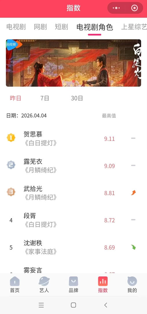 曾舜晞月鳞绮纪4.4数据 5分钟戏份V榜 百指 德塔文全面靠前了