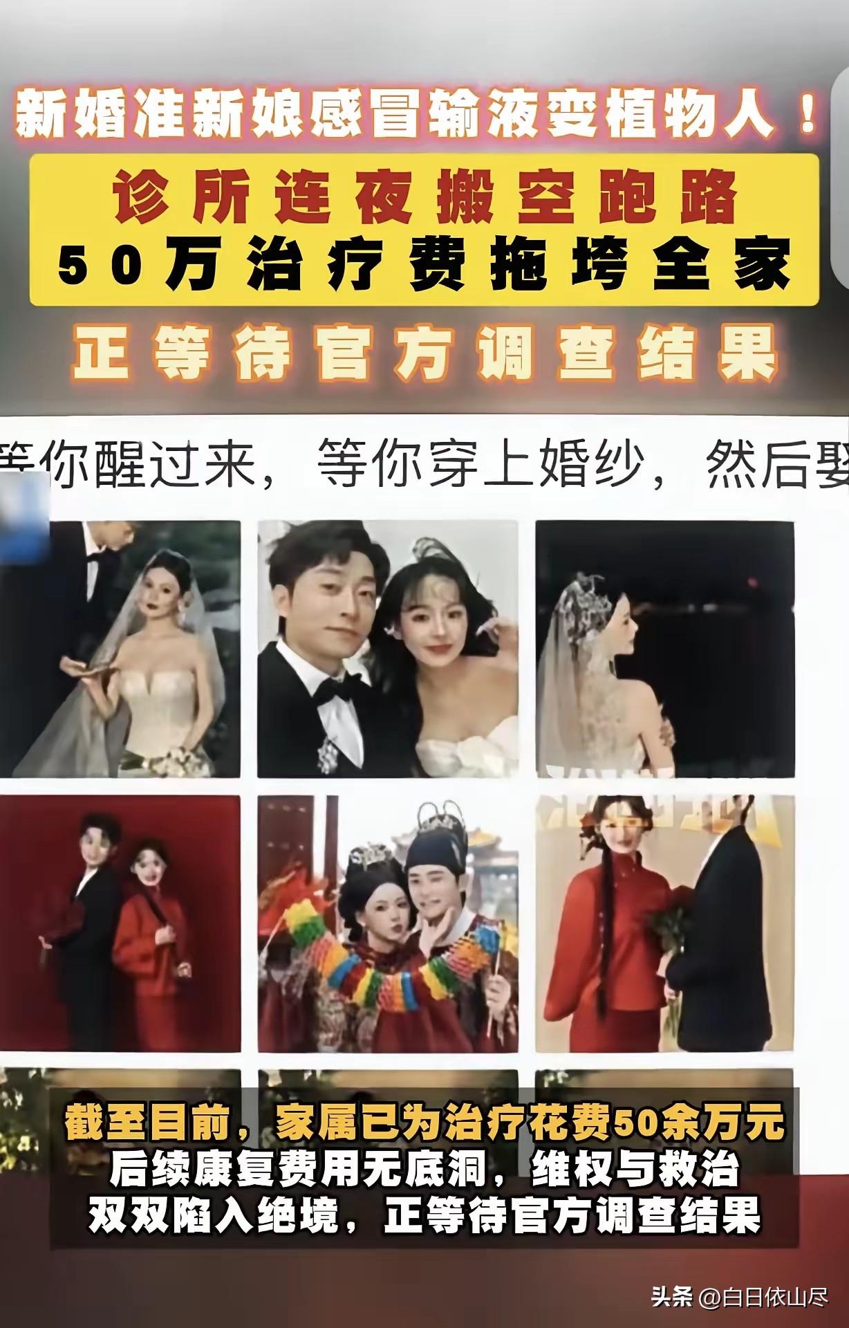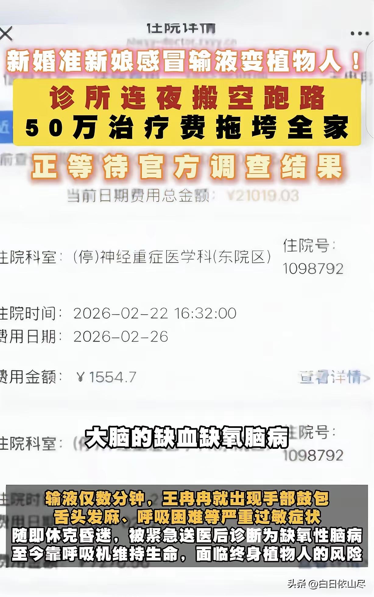 山东泰安,一24岁准新娘,还有2个月结婚,因轻微感冒,就去诊所看病,接诊医生简单问了几句,就给她输液,几分钟,女子就手鼓包,舌头发麻,喘不上气,很快休克昏迷,被确诊缺氧性脑病,有可能成为植物人,诊所一看大事不好,连夜搬空跑路,女子治病已经花了50多万,后面的治疗费还是无底洞,家人直接崩溃了! 事发山东泰安,这名女孩年仅24岁,人生正处于最美好的阶段,她早已和未婚夫定下婚期,距离举办婚礼只剩下短短两个月时间。这段时间里,她满心欢喜地筹备着婚礼相关事宜,憧憬着婚后的幸福生活,身边的亲友也都在为这场喜事忙碌,一切都朝着圆满的方向发展。 临近婚期,女孩不小心患上轻微感冒,症状并不严重,没有高烧不退,也没有剧烈咳嗽,只是轻微的鼻塞和身体乏力。她想着尽快养好身体,不耽误婚礼筹备,便就近选择了家附近的一家诊所,想着简单治疗后能快速恢复,继续忙婚礼的相关事情。 女孩走进诊所后,接诊的医生没有按照正规诊疗流程操作,既没有使用体温计为女孩测量体温,了解身体基础状况,也没有针对后续要使用的输液药物,为女孩做过敏皮试,排除用药风险。只是简单询问了几句感冒症状,就草草开具了输液的药物,准备为女孩进行输液治疗。 医生快速配好药物,为女孩完成静脉穿刺,开始输液。女孩原本以为输完液身体就能好转,安心等待婚礼到来,万万没想到,输液仅仅过了几分钟,意外就突然发生,身体接连出现严重的异常反应,原本轻微的感冒,瞬间演变成危及生命的危急情况。 最先出现的异常是输液的手部,针孔位置快速鼓起大包,伴随着明显的肿胀和不适感,紧接着女孩感觉舌头发麻,口腔和咽喉部位出现僵硬感,随后呼吸变得急促困难,像是有东西堵住气管一样,无法正常喘气。症状发展速度极快,短短片刻,女孩就直接休克昏迷,失去了意识。 见女孩情况危急,诊所工作人员才开始慌乱,却没有采取规范有效的急救措施,错过最佳抢救时间。女孩被紧急送往大医院抢救,经过全面检查和诊断,最终被确诊为缺氧性脑病,因为脑部长时间缺氧,神经受到严重损伤,后续醒来的概率极低,极有可能终身成为植物人。 女孩的家人得知诊断结果后,彻底崩溃,无法接受好好的准新娘,因为小感冒输液变成这样,更让他们气愤的是,涉事的诊所得知女孩病情严重,事情闹大后,没有承担任何责任,反而在事发后连夜搬空诊所内的所有物品,相关人员全部跑路,彻底失联,找不到任何踪迹。 从女孩出事到现在,为了给她治病,家人已经掏空所有积蓄,四处向亲友借钱,前前后后花费的治疗费用,已经达到50万元。可女孩的病情依旧没有好转,后续的康复治疗、护理用药等都是一笔天文数字,如同无底洞一般,看不到尽头,整个家庭被彻底拖入绝境。 曾经满心欢喜期待婚礼的女孩,如今只能躺在病床上,靠着医疗设备维持生命,原本幸福的家庭,整日被悲伤和绝望笼罩。家人一边要照顾昏迷不醒的女孩,一边要四处寻找跑路的诊所负责人,想要讨一个说法,承担该负的责任,却始终没有任何进展,每天都在煎熬中度过。 这场悲剧的发生,完全是因为诊所诊疗流程严重不规范,省略了测体温、做皮试等关键步骤,才导致女孩出现严重药物过敏,引发后续一系列严重后果。而诊所事发后连夜跑路的行为,更是让本就绝望的家庭,雪上加霜,没有任何依靠和维权的方向。 24岁的年纪,本该拥有幸福的人生和美满的婚姻,却被一场违规诊疗彻底打碎,50多万的治疗费压垮整个家庭,诊所负责人失联跑路,留下病重的女孩和崩溃的家人。这样的遭遇,让人既心疼又气愤,也给所有人敲响了就医安全的警钟。 女孩的家人始终没有放弃治疗,依旧期盼着能有奇迹出现,女孩能醒来,同时也在持续寻找诊所负责人,希望能通过合法途径,为女孩讨回公道,承担相应的责任,支付后续的治疗费用,让女孩能得到更好的救治。 对此,你们有什么看法,欢迎评论留言~