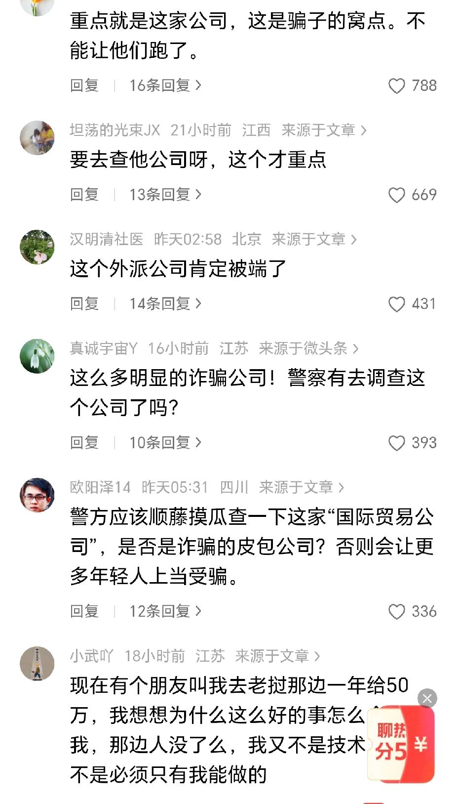 有网友说,小周真是幸运的,被警方劝回来了!这个外派公司肯定被端了!还有网友说,外出务工真的需要多个心眼,尤其是东南亚,一不小心就被骗了。网络找工作陷阱