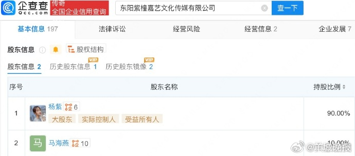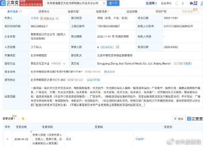 【#杨紫卸任名下一公司职务#】 #杨紫接连卸任名下公司高管# 企查查APP显示,近日,东阳紫橦嘉艺文化传媒有限公司北京分公司发生工商变更,负责人由变更为马海燕。该公司成立于2022年,经营范围包括电影摄制服务、文艺创作、文化娱乐经纪人服务等,其总公司为东阳紫橦嘉艺文化传媒有限公司。值得一提的是,今年1月,杨紫已卸任总公司东阳紫橦嘉艺文化传媒有限公司的职务。目前,杨紫仍持有总公司90%股份。(大象新闻)更多消息:#月鳞绮纪直播##小S称小女儿是皇后##阚清子参加浪姐瘦了一圈##桃黑黑直播打嘴抽脸##江语晨急寻律师##找到邓家佳不来浪姐的原因了#(编辑:杨雨桐;审签:谢杨柳)