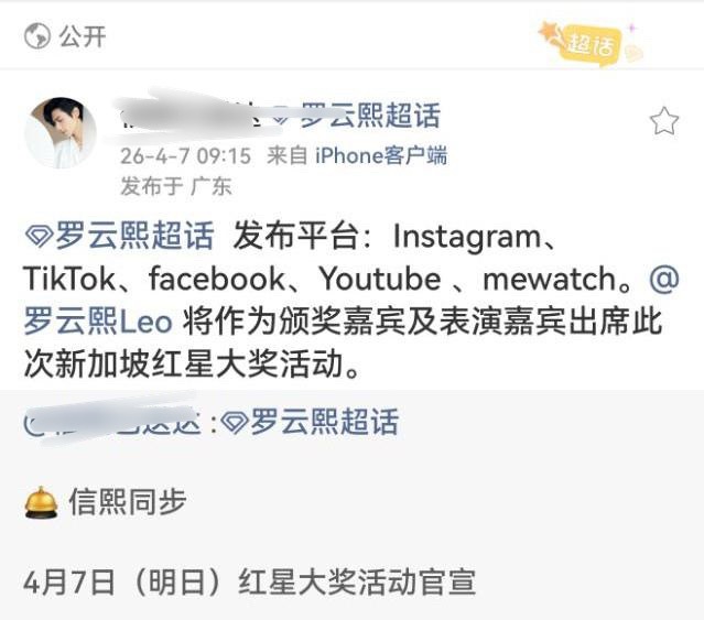 罗云熙将作为颁奖嘉宾出席新加坡红星大奖活动,上一届颁奖嘉宾是周润发,含金量还在不