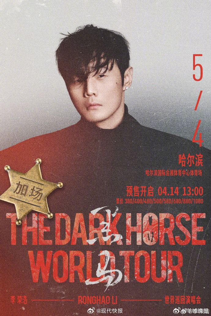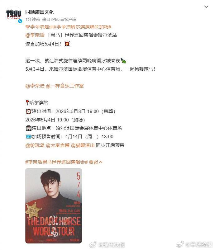 【#李荣浩演唱会加场哈尔滨# 】4月7日,和发文宣布:「黑马」世界巡回演唱会哈尔滨站惊喜加场5月4日,加场演出将于4月14日(周二)13:00开启预售。目前,李荣浩哈尔滨演唱会5月3日晚的场次已经售罄。 (现代快报)更多消息:#电影青铜葵花定档##周杰伦 江语晨##妻子的浪漫旅行嘉宾阵容##江语晨说才刚离婚别这样##金莎孙丞潇上夫妻综艺了##余茵暴瘦#(编辑:杨雨桐;审签:谢杨柳)