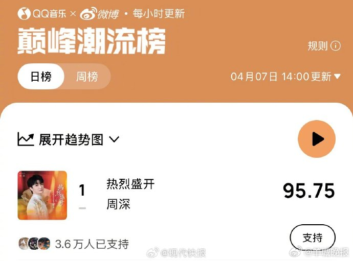 #周深热烈盛开登顶音乐榜单#【#周深热烈盛开收听峰值超3万#】4月7日,献唱的2026苏超主题曲《热烈盛开》上线即引爆热度。歌曲最高超3万人同时在线收听,成功闯入QQ音乐听歌排行榜前100,并登顶QQ音乐巅峰潮流榜日榜第一,用昂扬旋律诠释拼搏力量,展现强劲市场号召力。 (现代快报)更多消息:#周杰伦 江语晨##瞿颖 肉毒起作用了##喜人奇妙夜##魏大勋青岛进组十日终焉##虞书欣工作室 审美##虞书欣和Jennie同款发型#(编辑:杨雨桐;审签:谢杨柳)